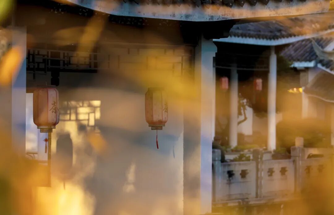 沿着水边走,风里裹着落羽的轻响。白墙黑瓦衬着檐下的红灯笼,一只橘猫正扒着窗沿打晃,橙红的杉叶垂下来,刚好挡住它圆滚滚的身子,只露出半截晃来晃去的尾巴 —— 像在跟路过的人玩捉迷藏。