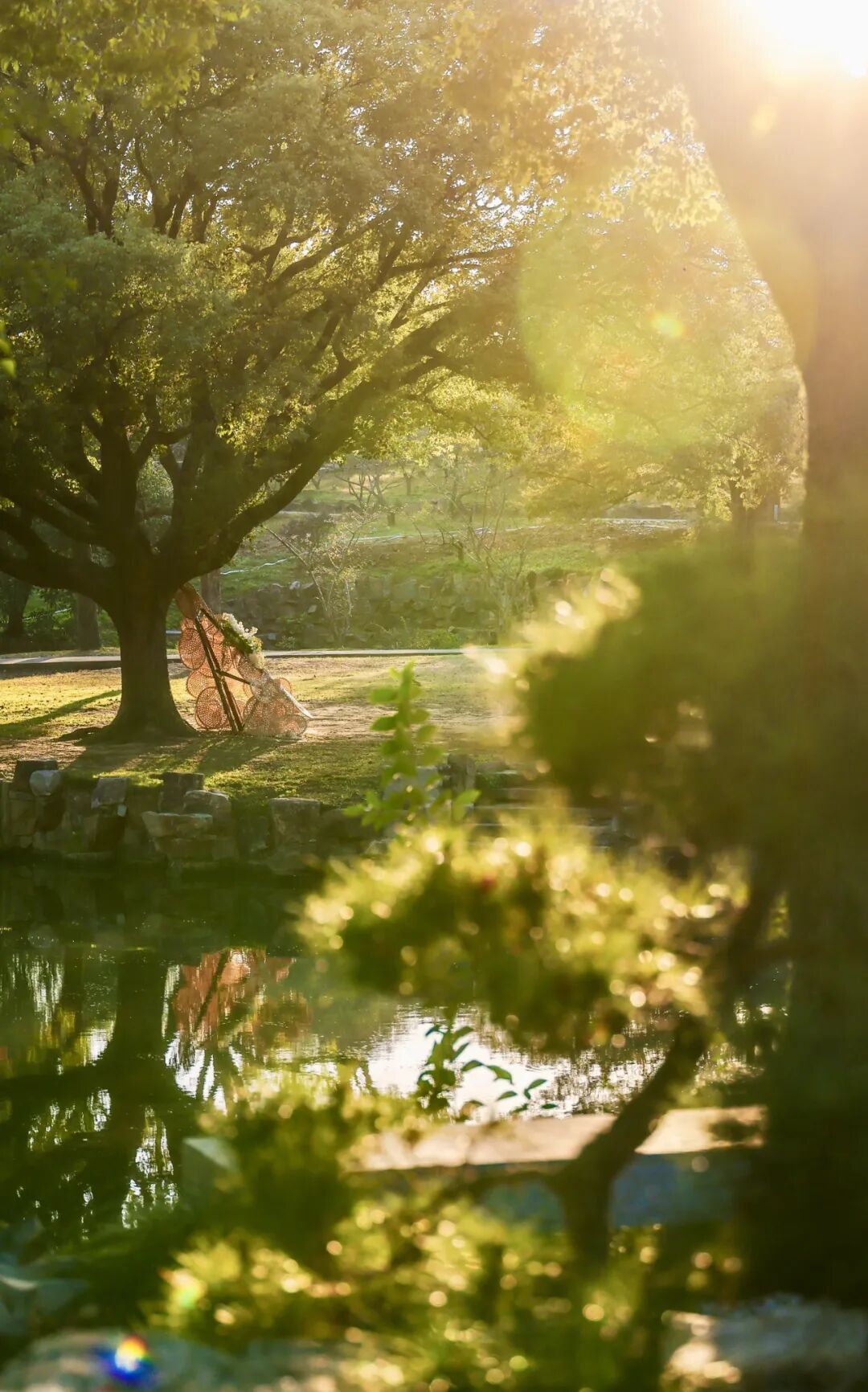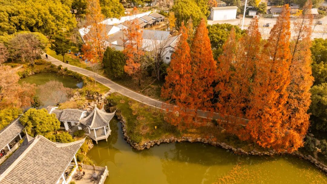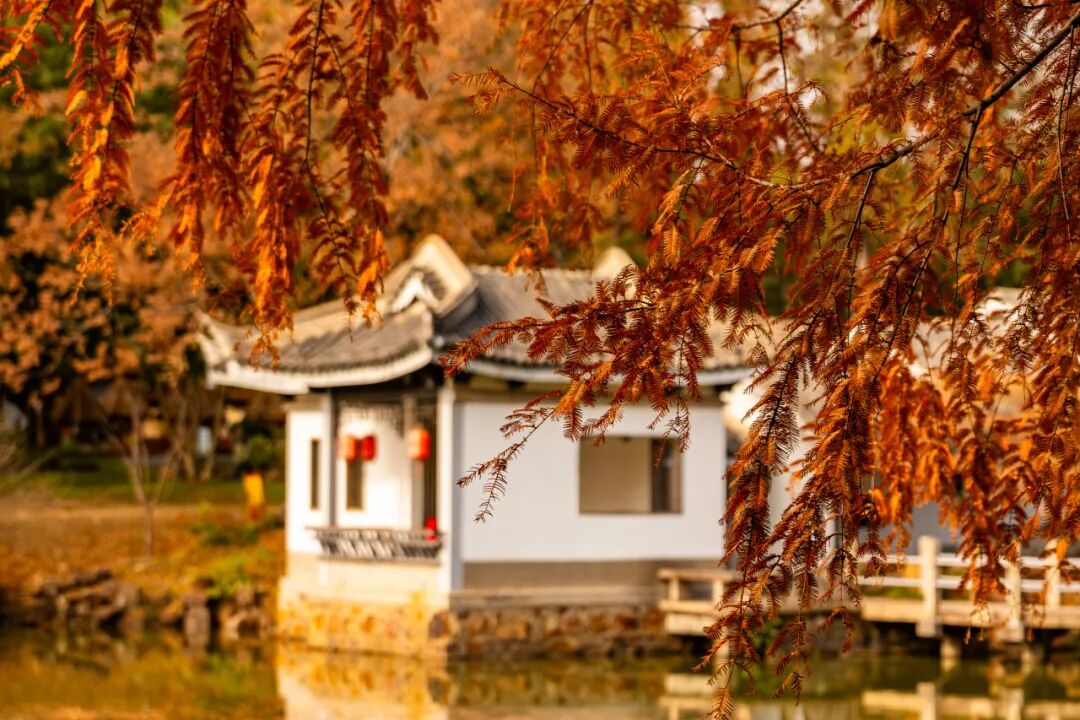 等猫主子们蜷着打盹时,梅园的初冬底色慢慢铺展开:落羽杉的红漫到水面,波纹把暖色调揉成细碎的光;中式小屋的白墙沾着杉叶的影,檐下红灯笼在风里轻晃;枝上的蜡梅花苞已悄悄鼓胀,清冽的气息裹着枯草的暖香。
