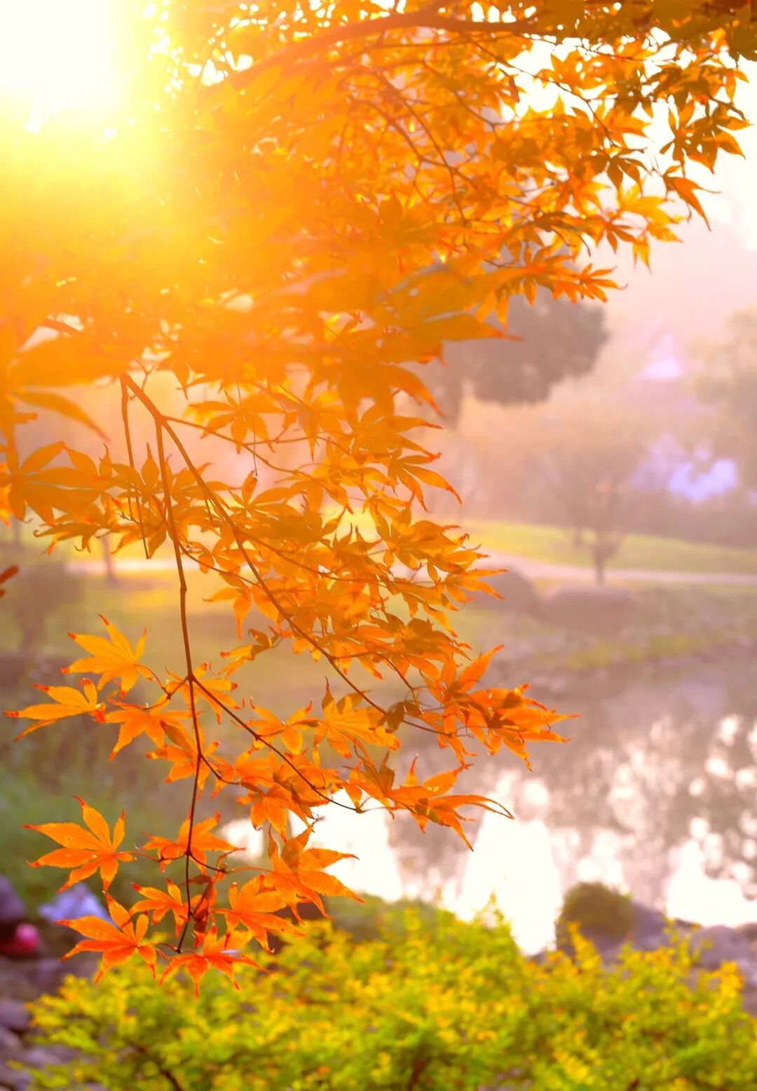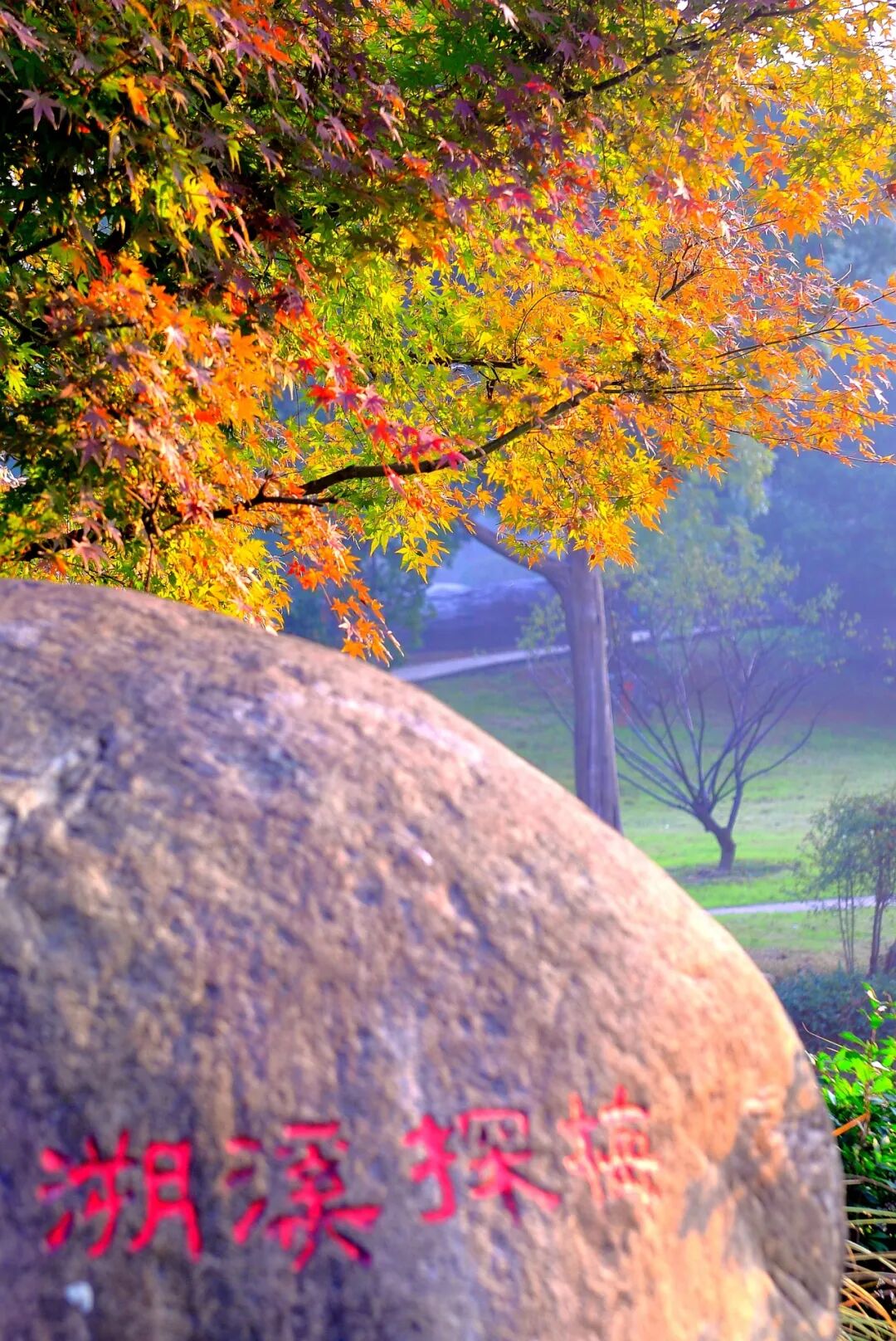 转至清芬轩旁,枫树则演绎着另一种热烈:青枫染绯红,三角枫晕橙黄,深浅不一的红色与黄色交织,风过时叶片摇曳,宛如一场 “秋日红雨”,为古木添了抹亮色。