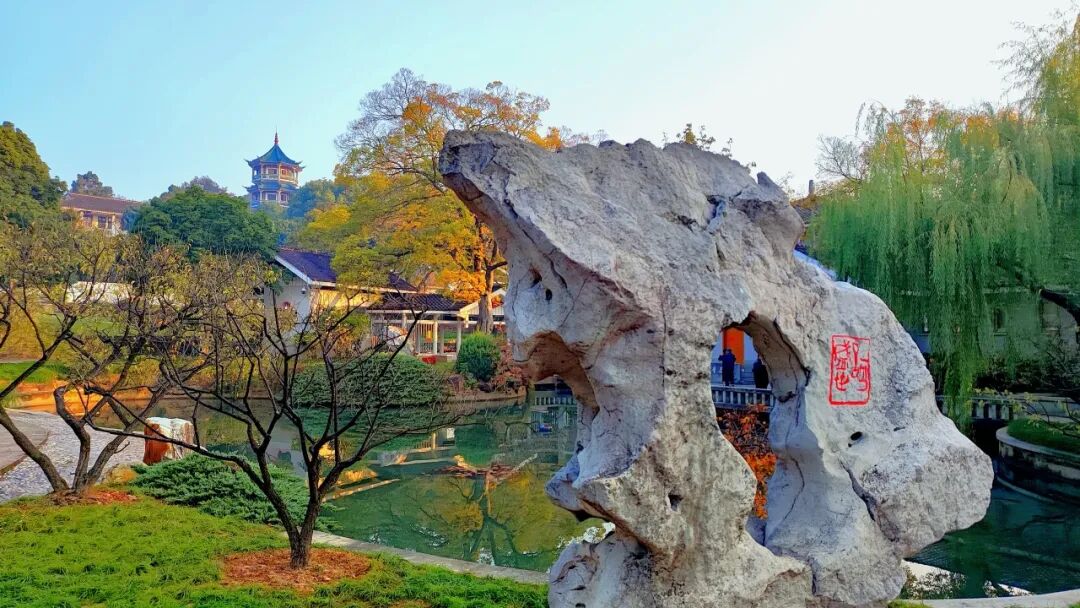 从花溪畔到念劬塔,沿途的色叶树层层叠叠,粉墙黛瓦在斑斓色彩中若隐若现。抬头是百年古木的苍劲,低头是落叶铺就的 “金色地毯”,远眺是满山绚烂的秋景,江南园林的秋意,就这样在一帧一画中被诠释得淋漓尽致。