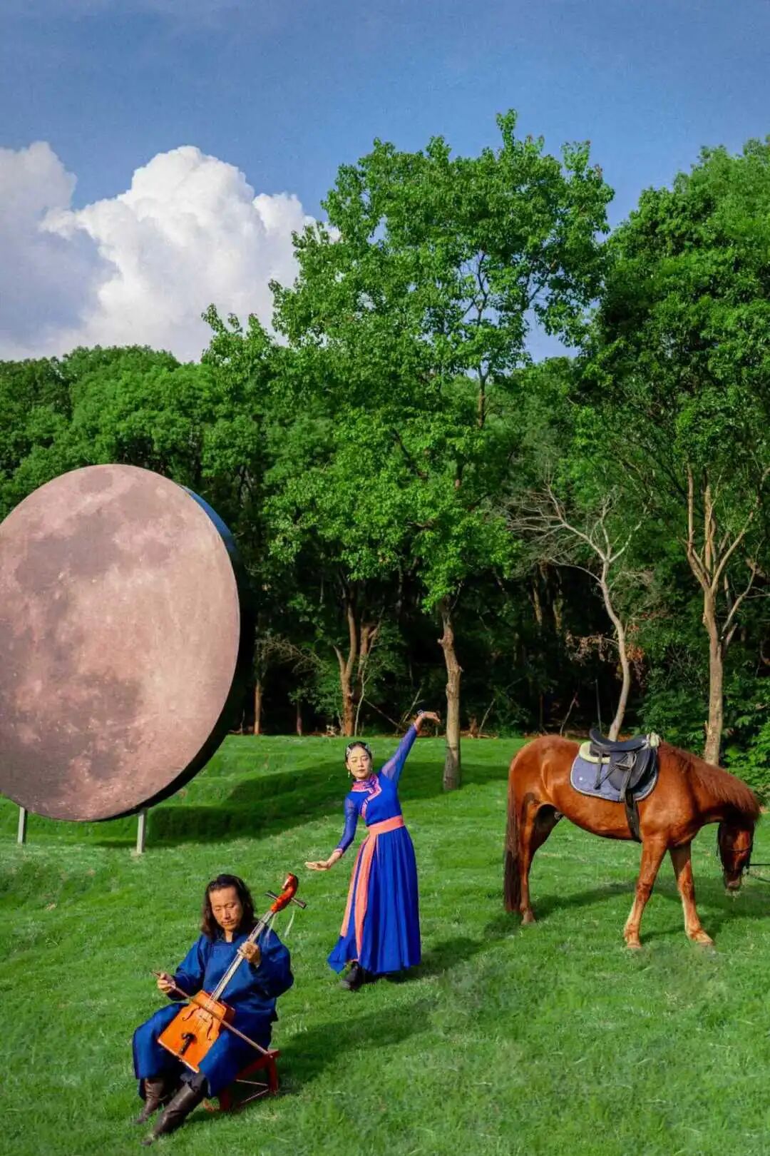 傍晚 6 点的慢谷最是热闹。「吹着湖风看对面小岛上的树和天上的‘月亮’装置,一天的疲惫都散了」。游客们偏爱在圆月装置与孤树同框的角度打卡,手机相册里装满了「草原即视感」的诗意画面。阶梯式设计让每个位置都成为观景台,举目是灯海,俯首见碧波,偶尔还能闻到蒙古包夜宴飘来的羊肉香