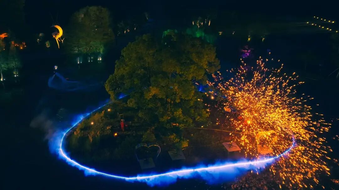 每晚 18:30和20:30,慢谷的夜空都会被点燃! 在草原的夜空下, 炽热的火光与灯海倒影在湖面形成对称美学
