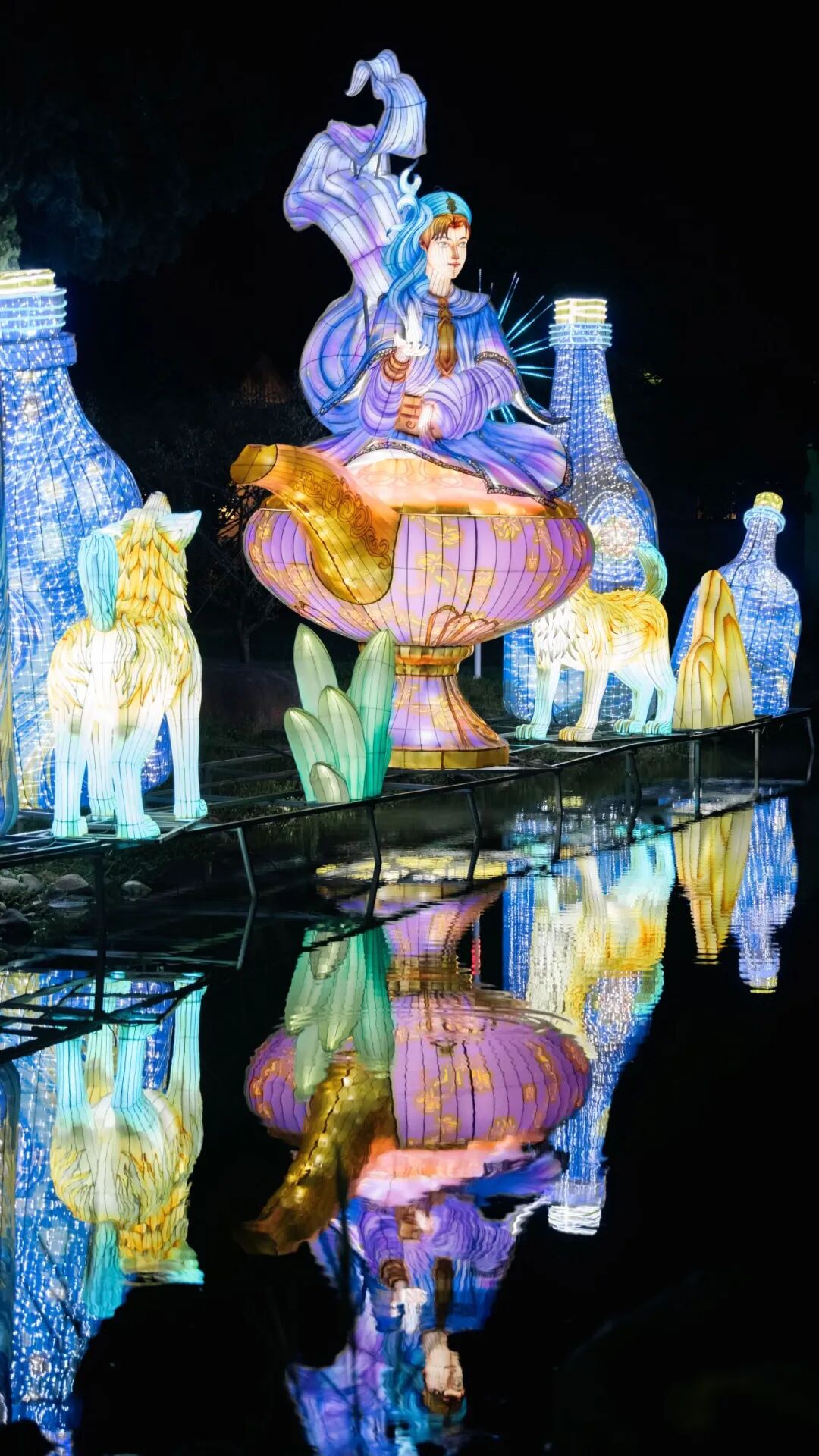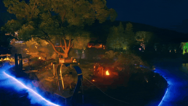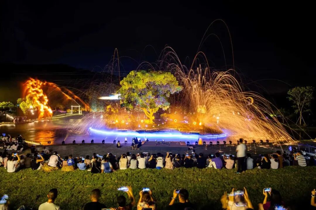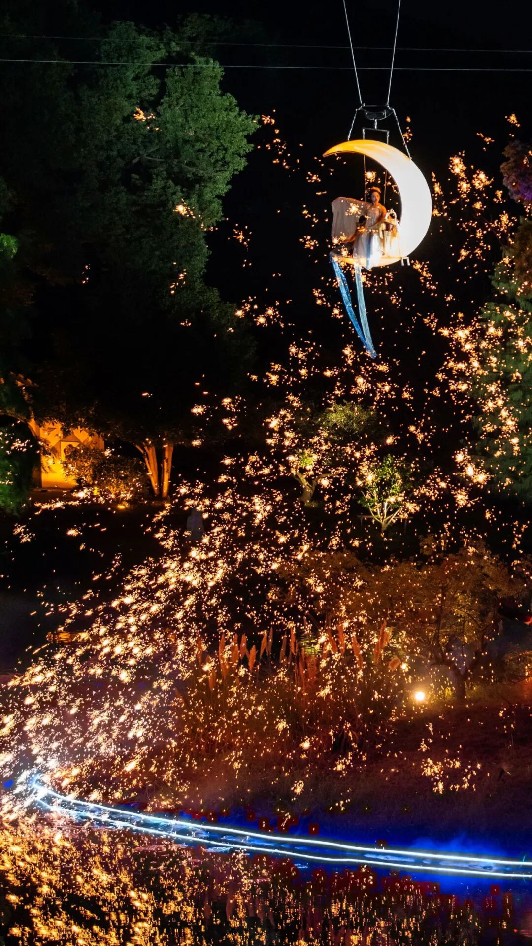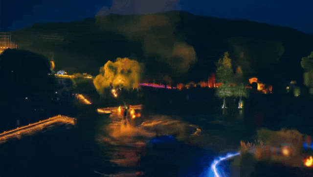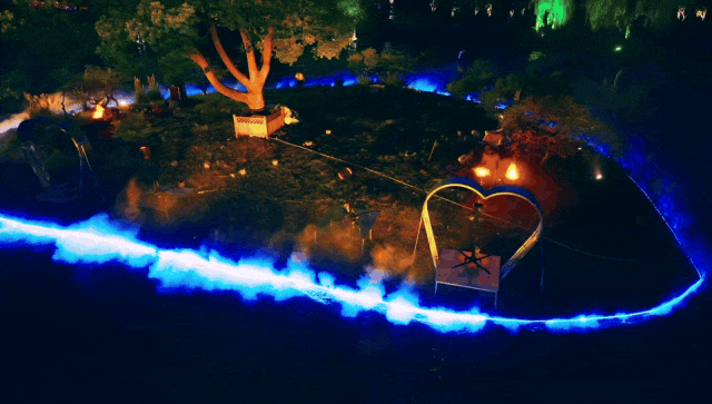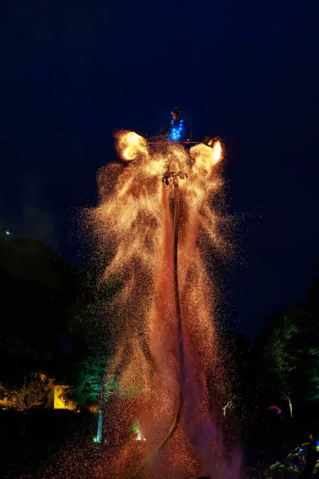当凤凰、鲲鹏在天际舞动时,湖心岛忽然被万千火光点亮:灵动的火圈如精灵般流转跳跃,似神兽踏火留下的足印。火焰藤蔓“攀爬”过岛上草木、石景,瞬间让小岛化“火树银花” 的秘境