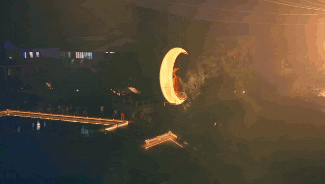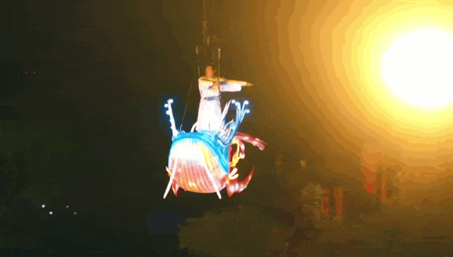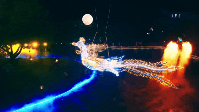 巨型明月悬浮天际,凤凰振翅而出!彩羽在月色下流光溢彩,它轻盈掠过湖面,尾羽带起花雨。鲲鹏的登场同样令人心潮澎湃,仿佛正进行 “水击三千里,抟扶摇而上者九万里”的壮游!