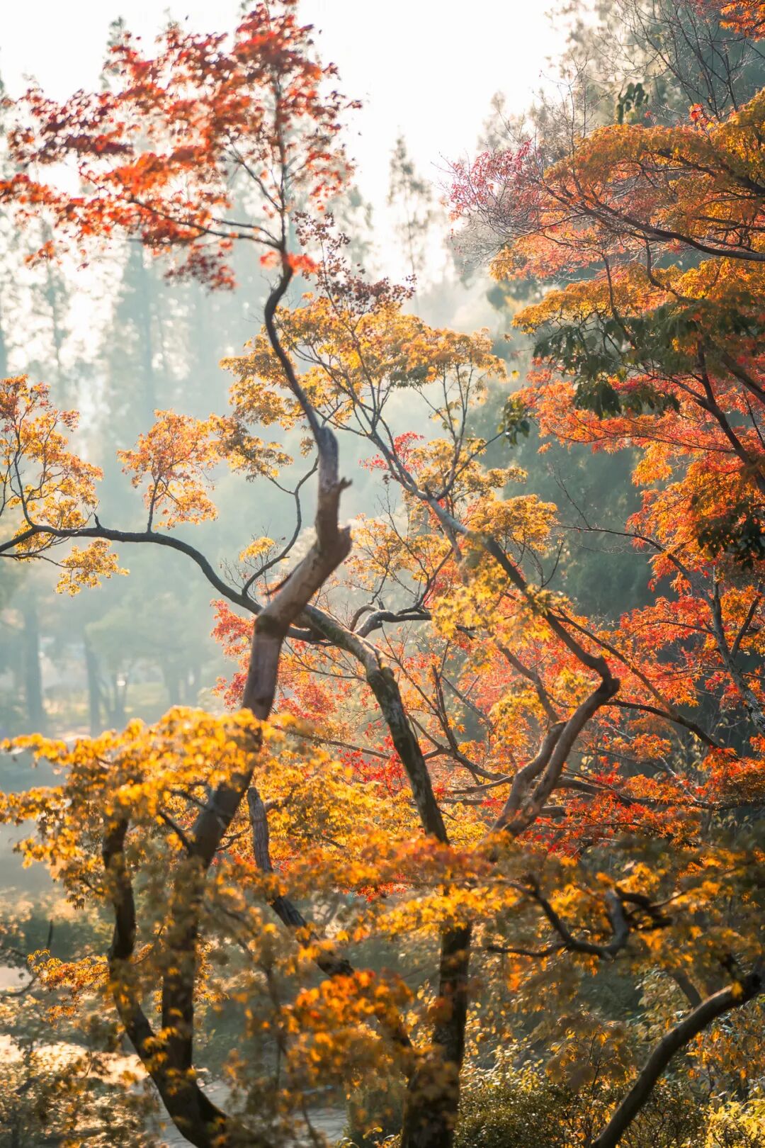 秋日的梅园,色彩是最动人的笔触。纪录片里春日的白梅、红梅此刻化作了 “层林尽染”:银杏将枝头染成金黄,阳光穿过叶片,在地面投下细碎的金箔;鸡爪槭褪去翠绿,晕开深浅不一的绯红,像被秋霜点染的胭脂;