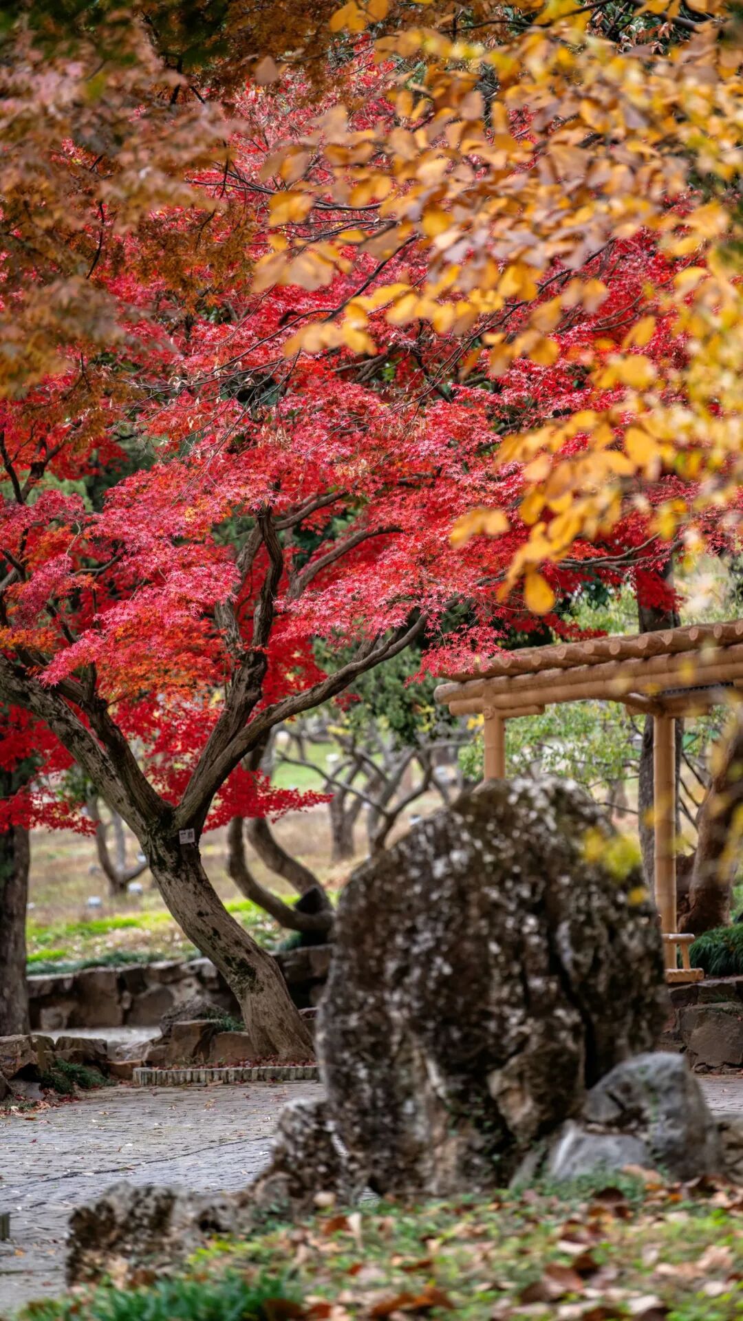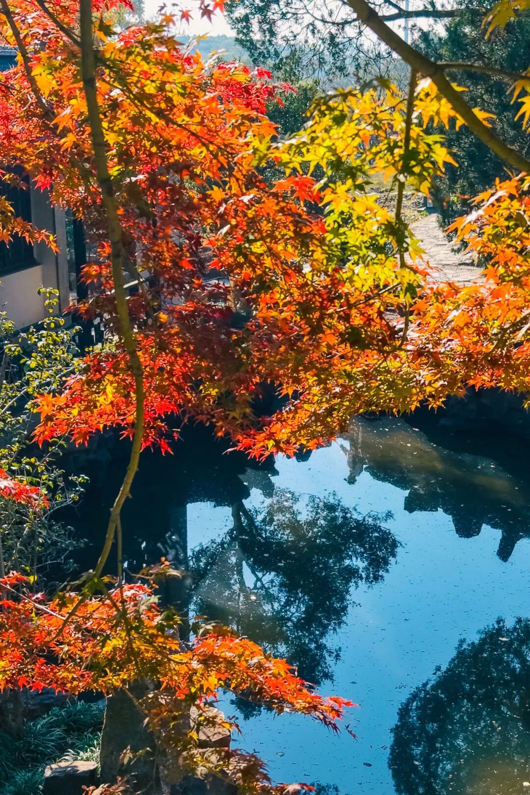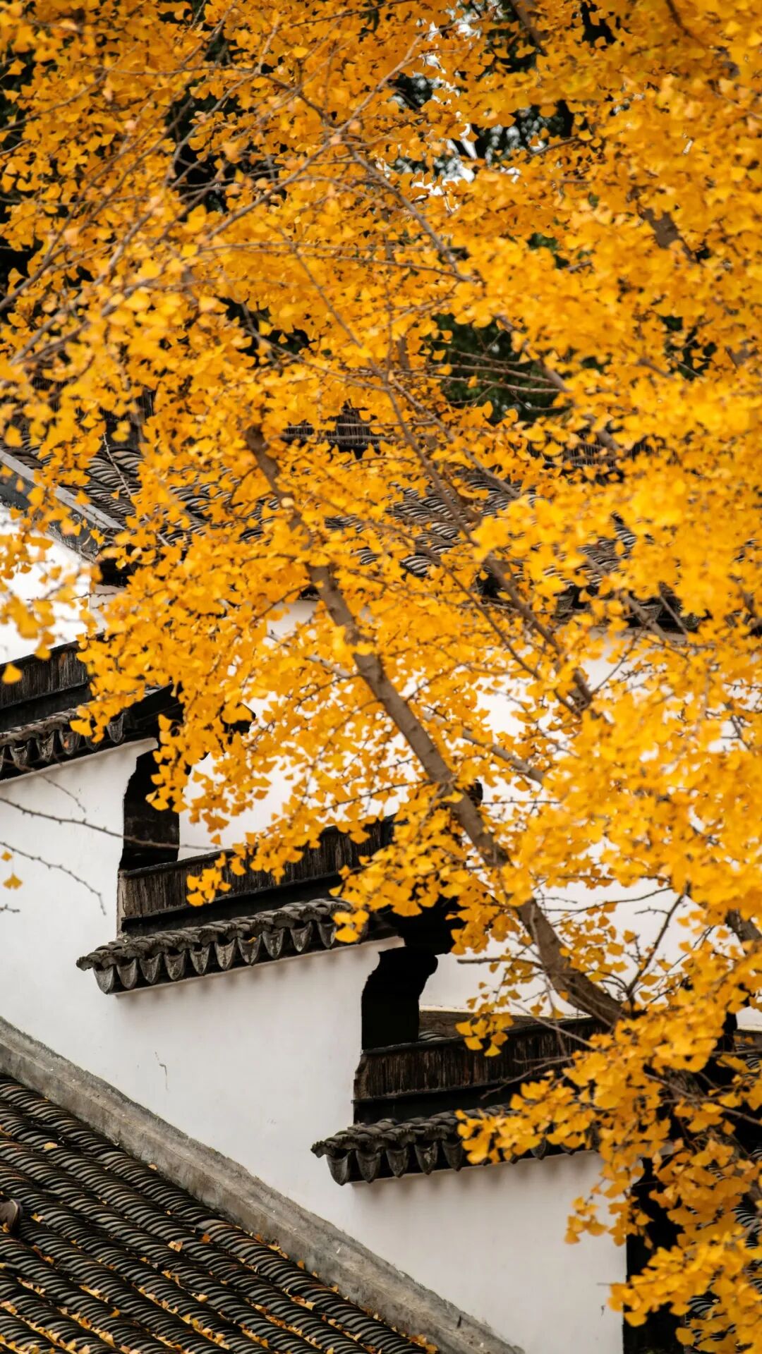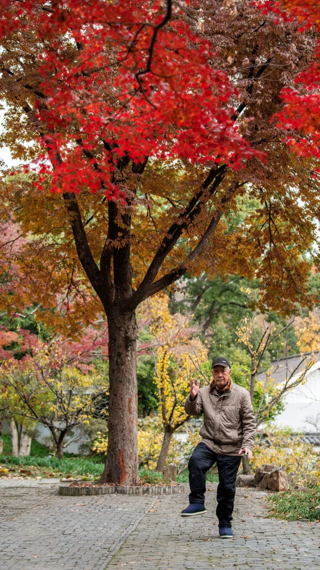 色叶树种渐次换装:清芬轩旁的青枫晕染绯红,三角枫泼洒橙黄,香海轩前路的银杏缀满金箔,阳光穿过枝叶,在青石板上投下细碎的光斑,踩上去沙沙作响,像是在诉说百年往事。