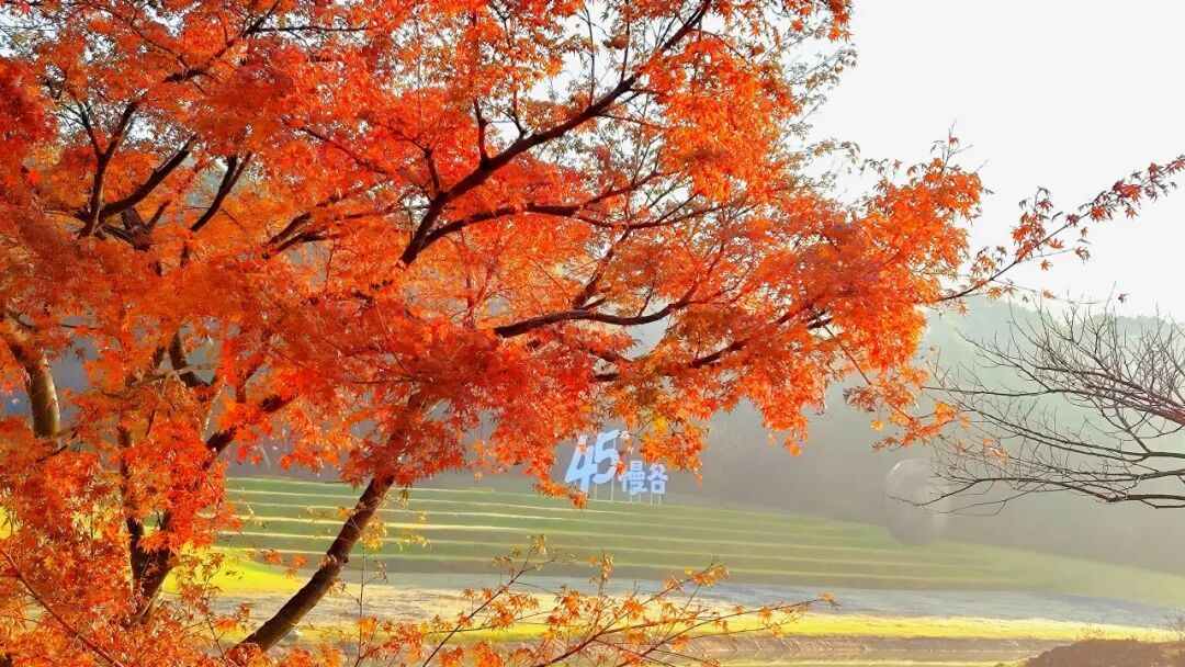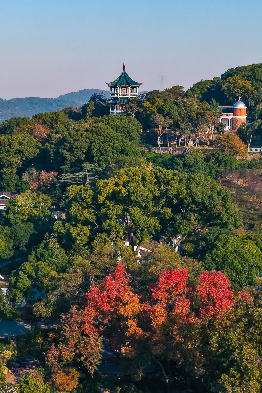 从花溪畔到念劬塔,沿途的色叶树层层叠叠,粉墙黛瓦在斑斓色彩中若隐若现。抬头是百年古木的苍劲,低头是落叶铺就的 “金色地毯”,远眺是满山绚烂的秋景,江南园林的秋意,就这样在一帧一画中被诠释得淋漓尽致。