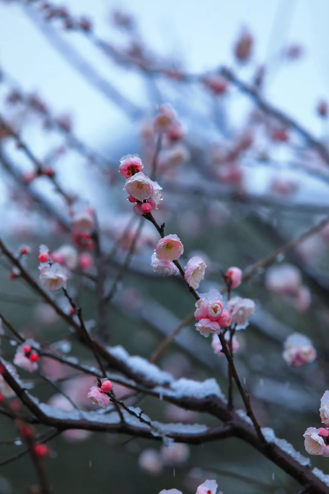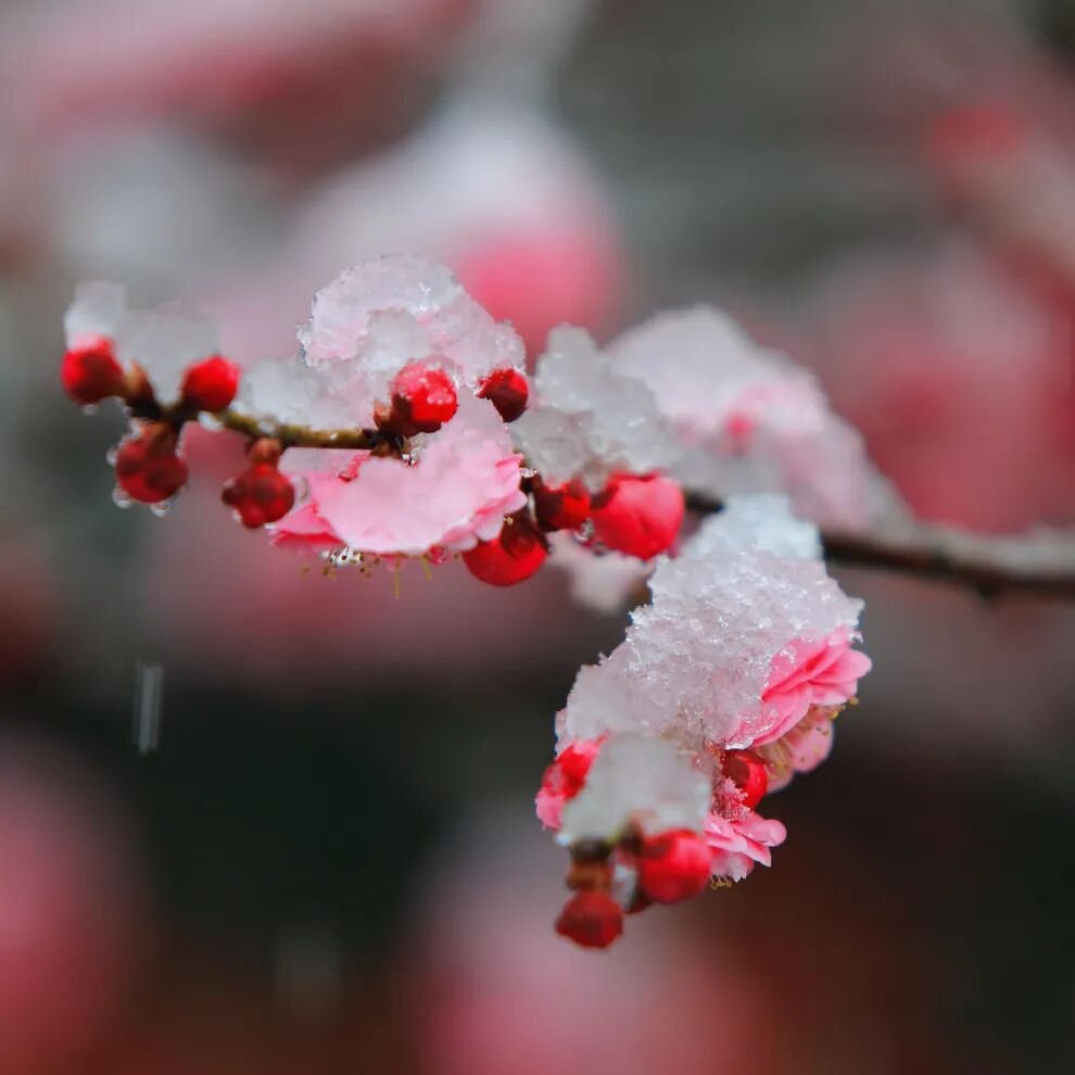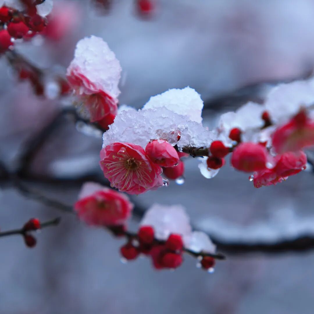 ![]() ![]() 红梅、白梅在枝头零星绽放,有的含苞待放,饱满的花苞如胭脂凝露;有的半开半合,似少女含羞带怯;偶有几朵全然舒展,娇嫩的瓣缘顶着薄薄一层积雪,冷与暖、素与艳在此刻完美交融。 ![]() ![]() ![]()