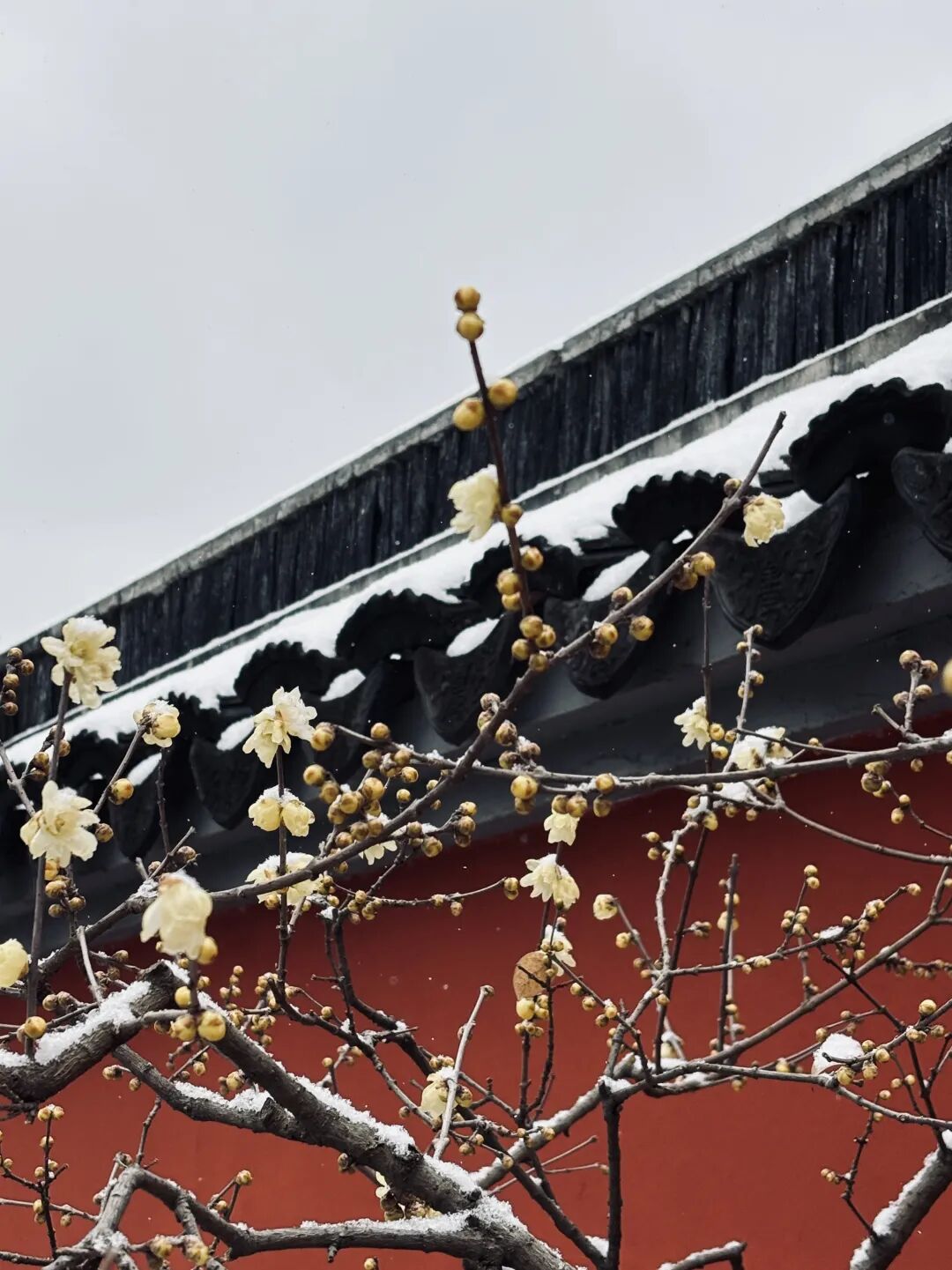 恰逢一年中最冷的时节,琼枝覆雪,暗香浮动,此刻园内蜡梅已绽放初具规模,梅花也携着娇羞悄然零星吐露芬芳,这场雪与梅的邂逅,正是冬日里最动人的馈赠。