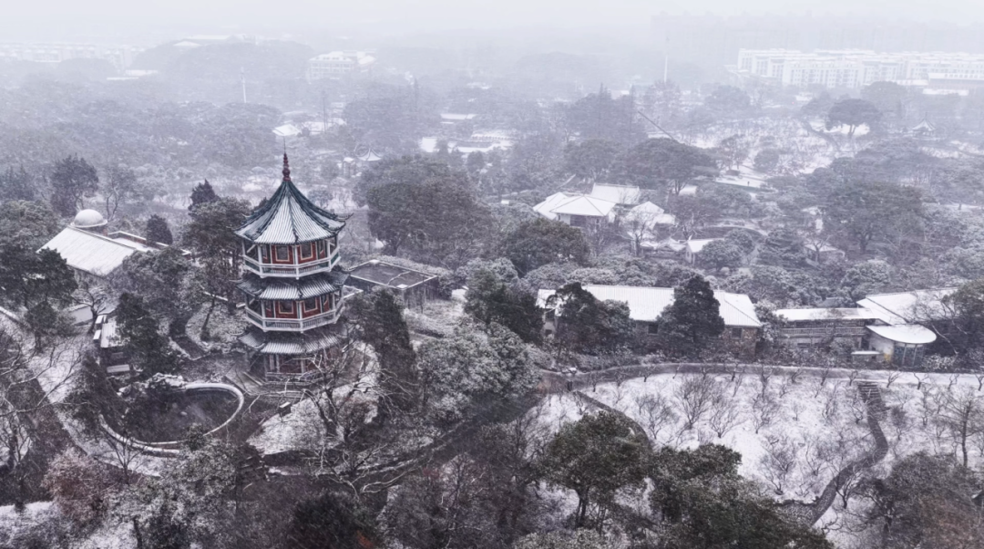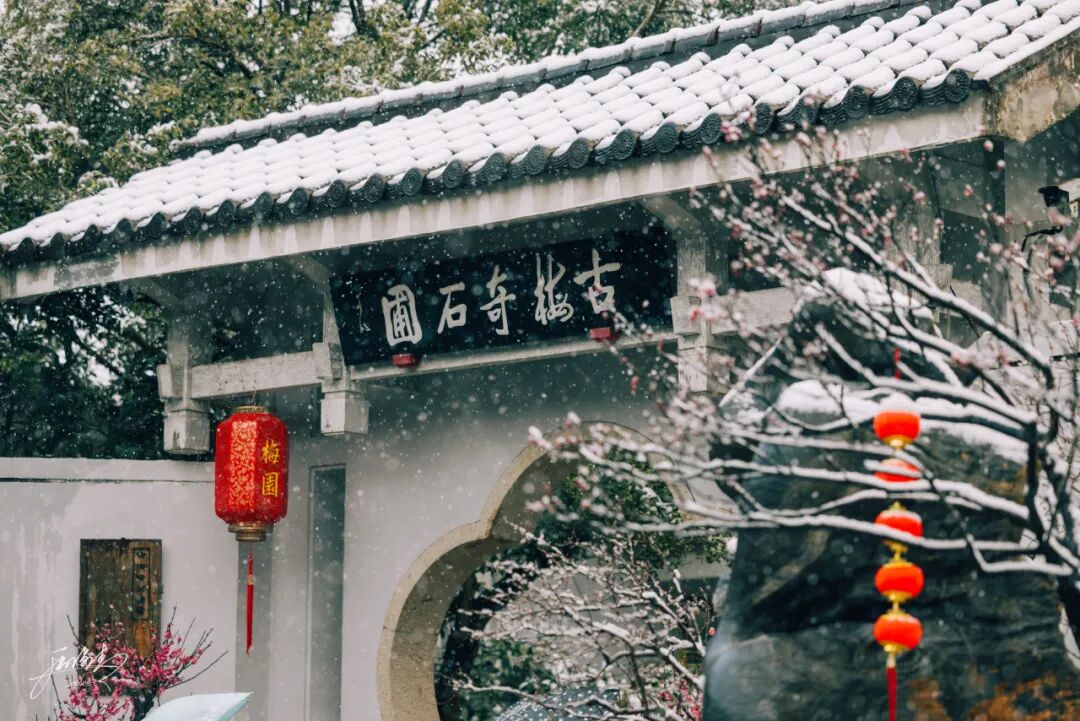 需要提醒大家的是,目前梅园仍处于闭园景观提升期间,暂无法接待游客入园游览。不过别遗憾,接下来就跟着这篇推文,一同“云赏”这片静谧的雪后梅园吧! ![]() ![]() ![]() 冬日信使 WINTER DAY 白雪却嫌春色晚,故穿庭树作飞花。 ![]() 雪是冬日的信使,轻柔地为梅园披上素白纱衣。远山隐去棱角,黛瓦覆满银霜,连蜿蜒的石径都铺上了一层松软的白毯,踩上去发出“咯吱咯吱”的轻响,成了这静谧天地里最治愈的伴奏。 ![]() ![]()