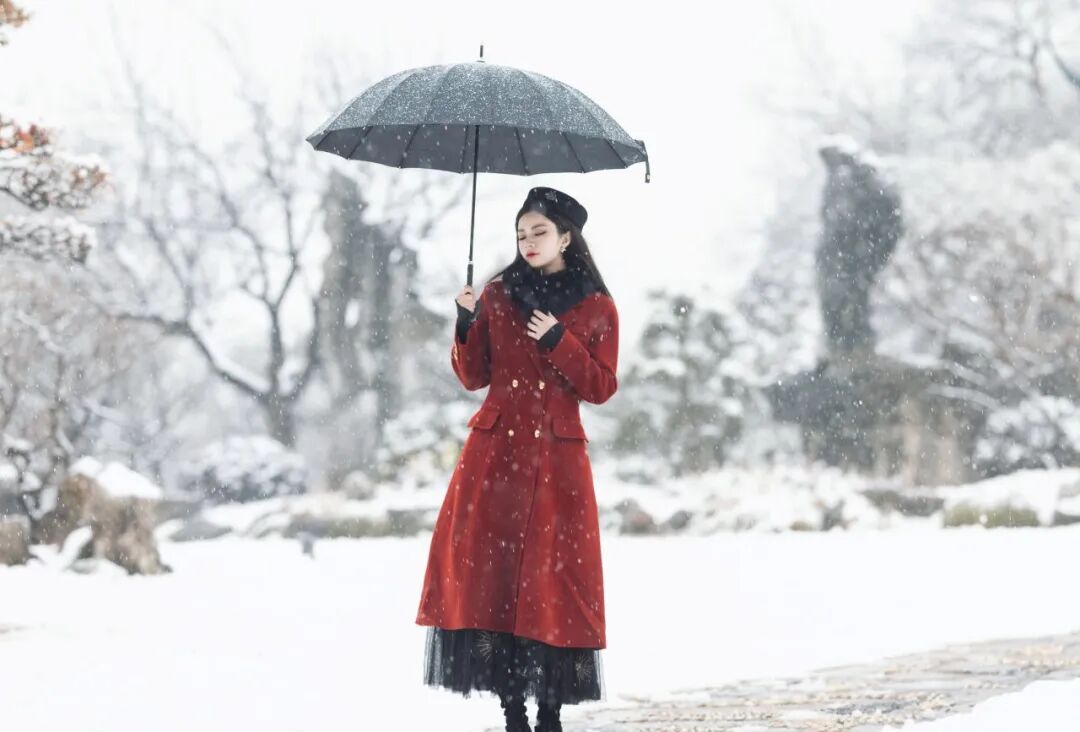 远处亭台翘角覆着薄雪,飞檐载霜、黛瓦凝白,与路边太湖石相映,青灰与素白交织,线条素雅灵动,偶尔雪粒从枝桠间簌簌滑落,将这份空灵晕染得愈发浓烈。