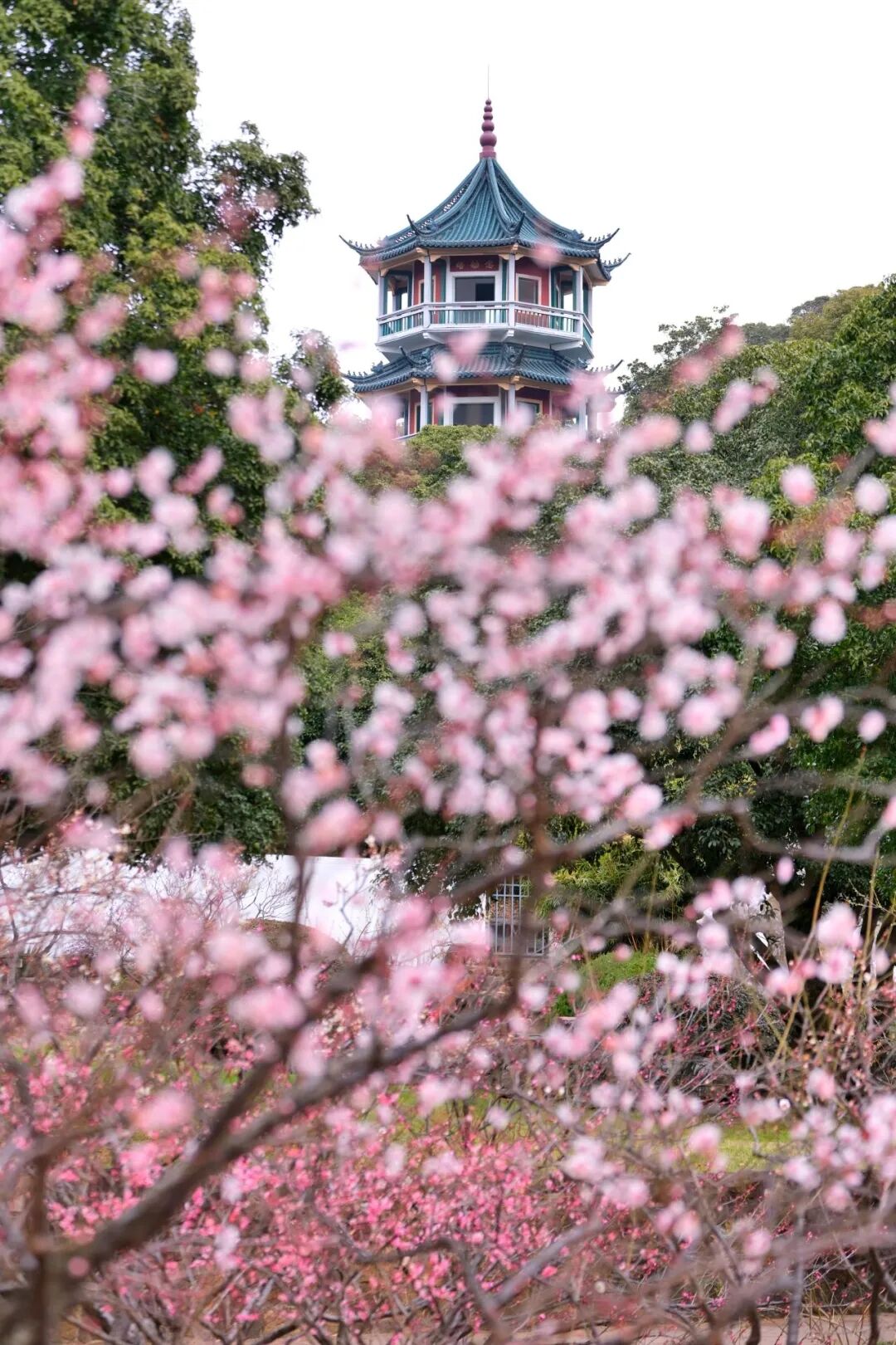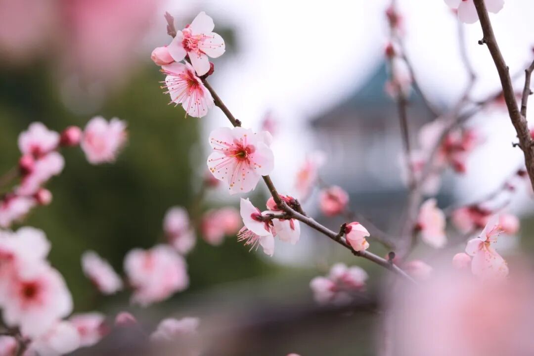 漫山梅朵缀满枝头,粉白相映、暗香浮动,亭台楼阁藏于花海之间,风过梅梢,落英轻舞,每一帧都是江南独有的诗意与温柔。