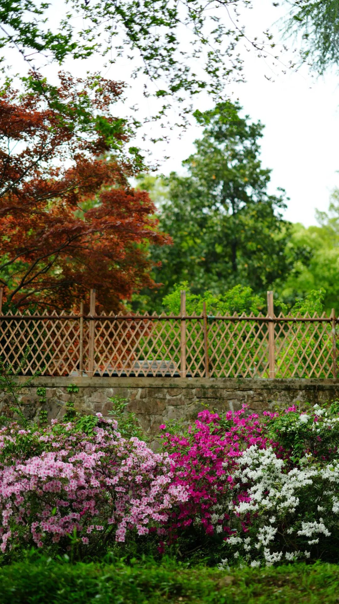 它们散落在梅园各处,而从乐农别墅到念劬塔的沿路,是杜鹃最热闹的舞台。嫣红、娇粉、玫紫的花瓣缀满枝头,层层叠叠漫染在林间,像被春日打翻的调色盘,把山路晕染成一片锦绣。雨后的花瓣沾着水珠,更添几分娇俏,风过时,落英轻舞,落在青石板上,也落在路过人的心头。