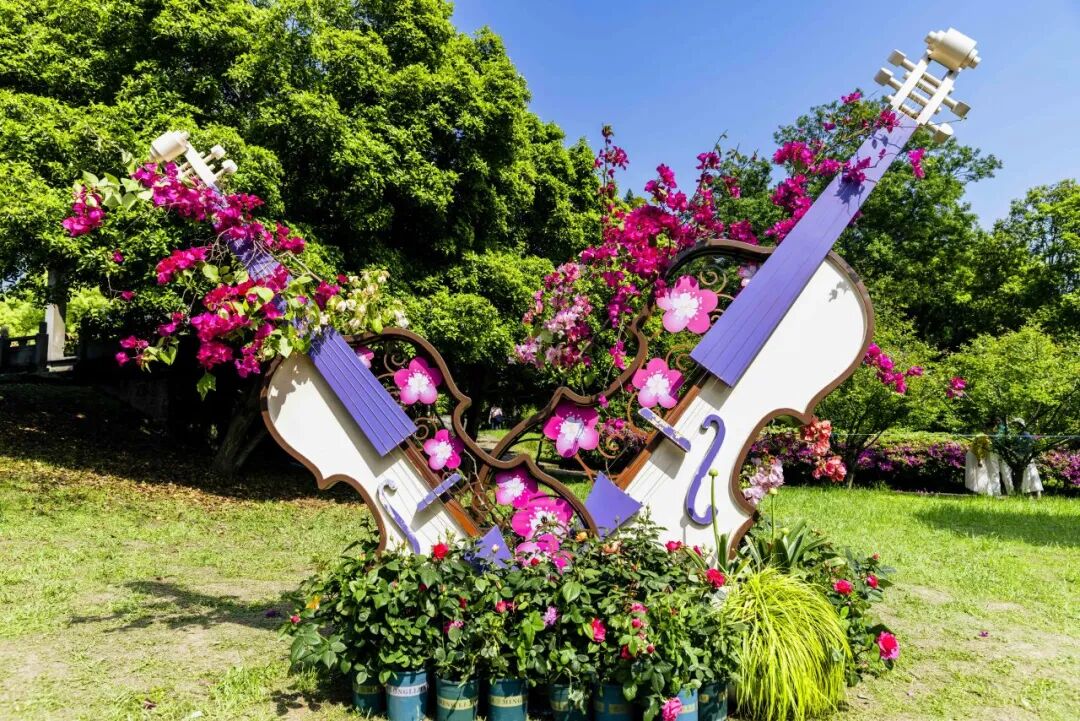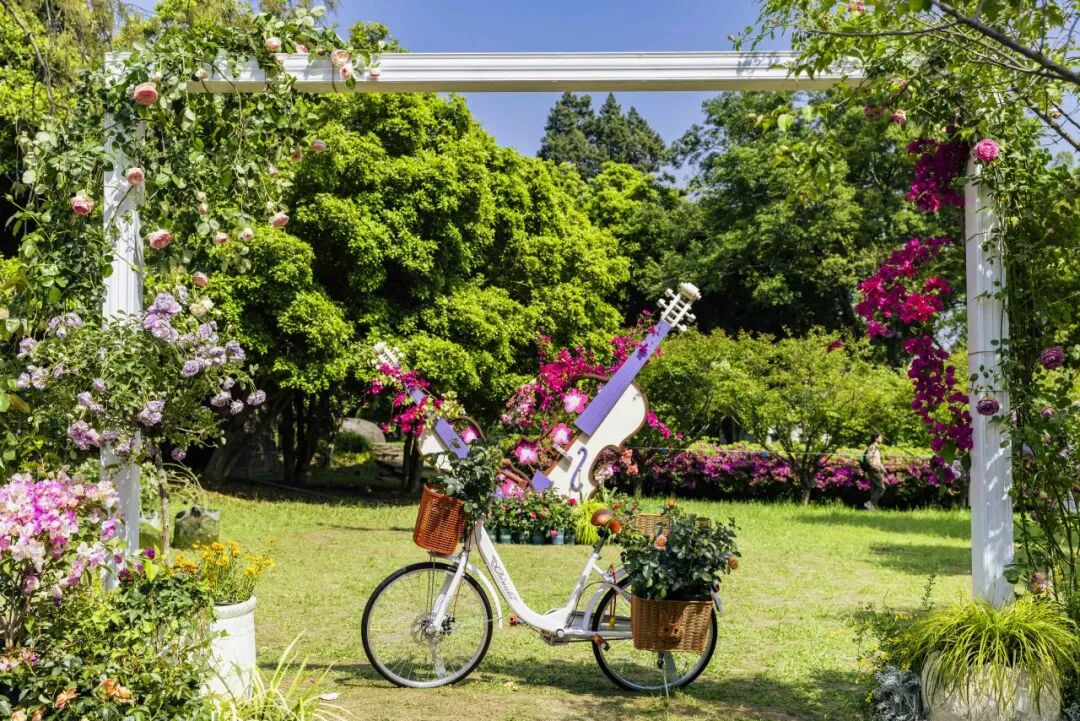 精心打造的月季花拱门长廊蜿蜒延伸 藤本月季沿拱架缠绕攀爬、花瀑垂落 层层花拱串联成梦幻花隧,穿行其间 繁花覆顶、绿意环绕 沉浸式邂逅花海诗意! ![]() ![]() ![]() 特色美陈 藏在花溪边的文艺小惊喜! 小提琴、自行车造型美陈 与花海完美融合,艺术感拉满~ 氛围感直接拉满,朋友圈赞爆!