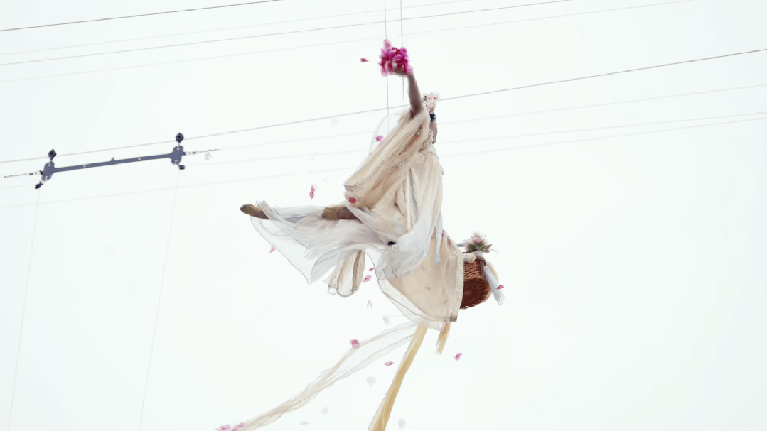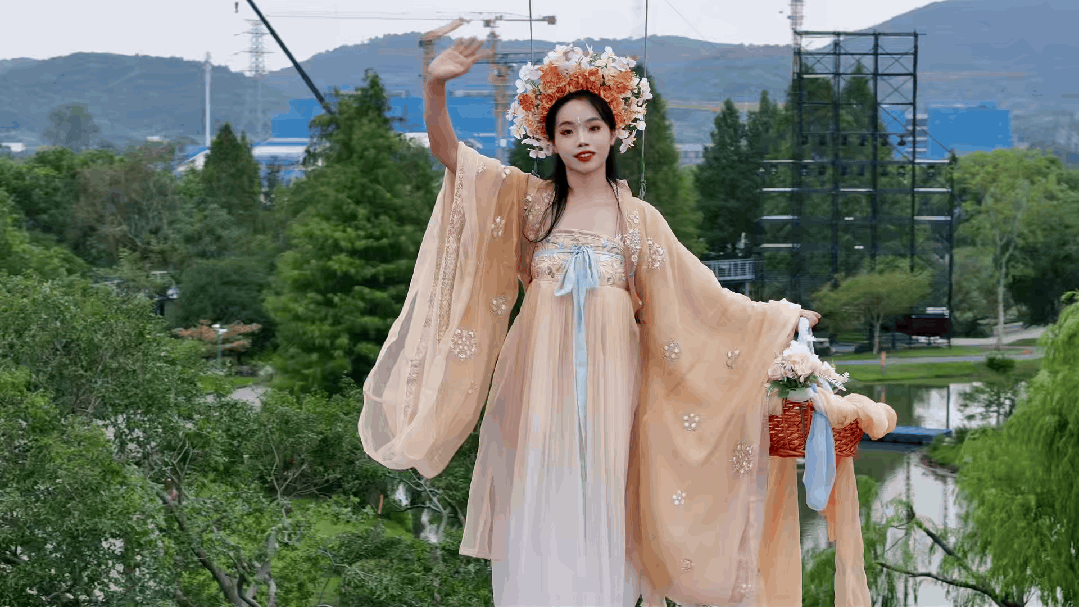 演员翩跹登场,在花海映衬下散花, 万千花瓣随微风落在花丛间 仿佛闯进仙境
