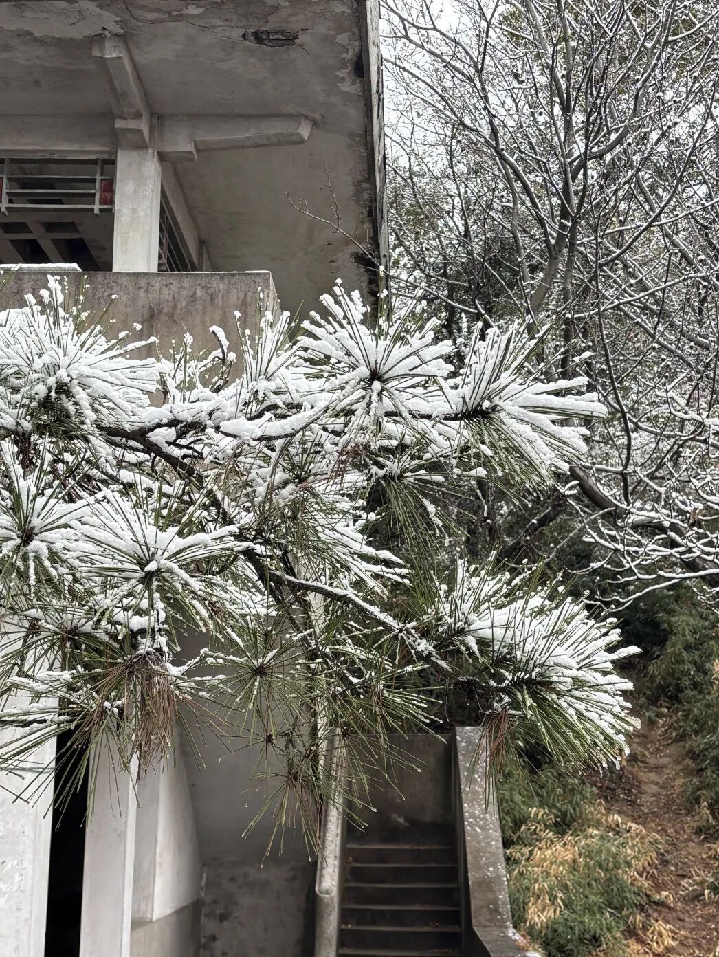 松枝裹着薄雪,亭檐覆着残白, 枝桠间的雪意迟迟未散。