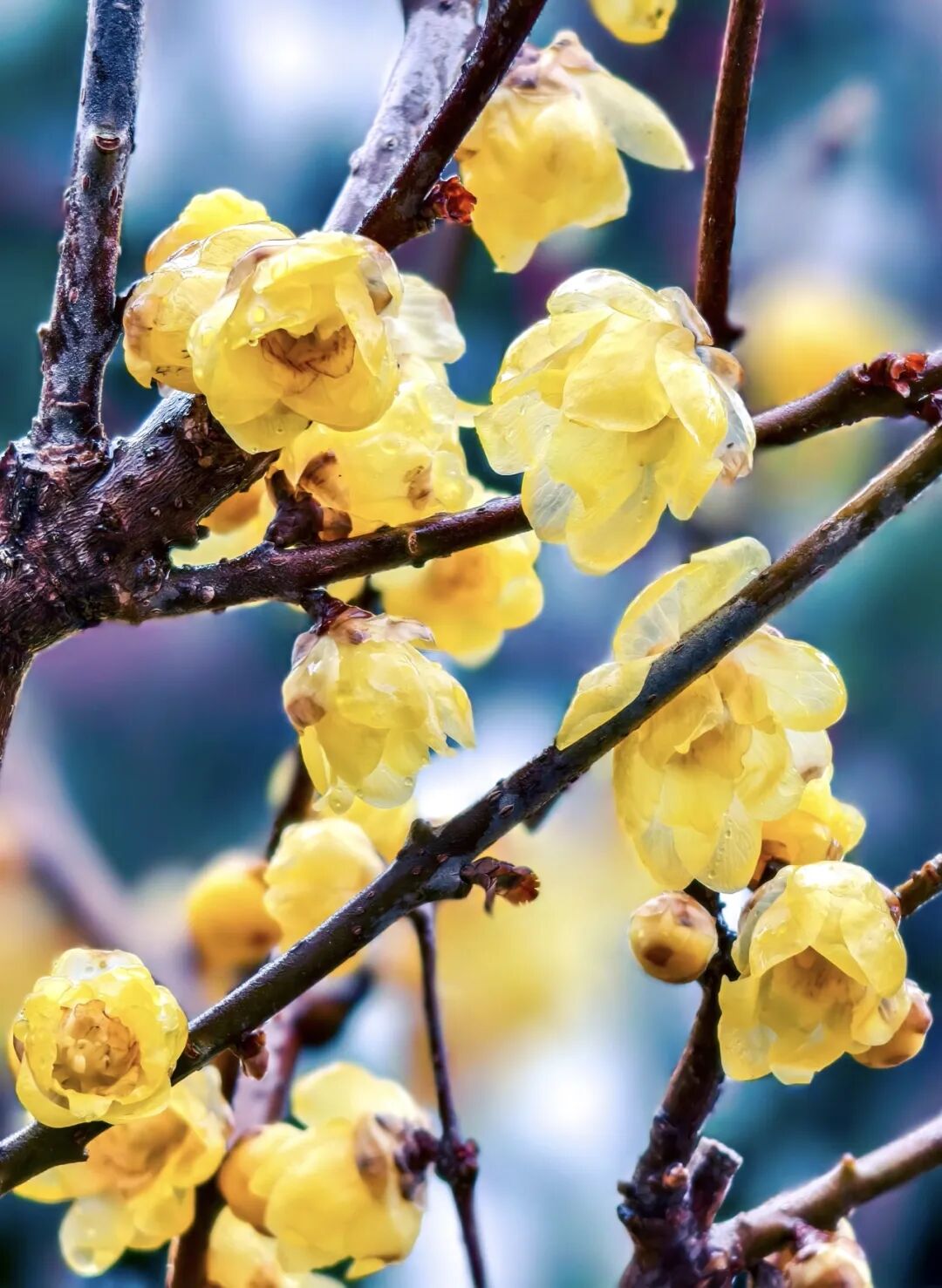 眼下园内的蜡梅开得正盛, 金黄的花缀满枝头,暗香浮动, 风一吹就是沁人心脾的甜香;
