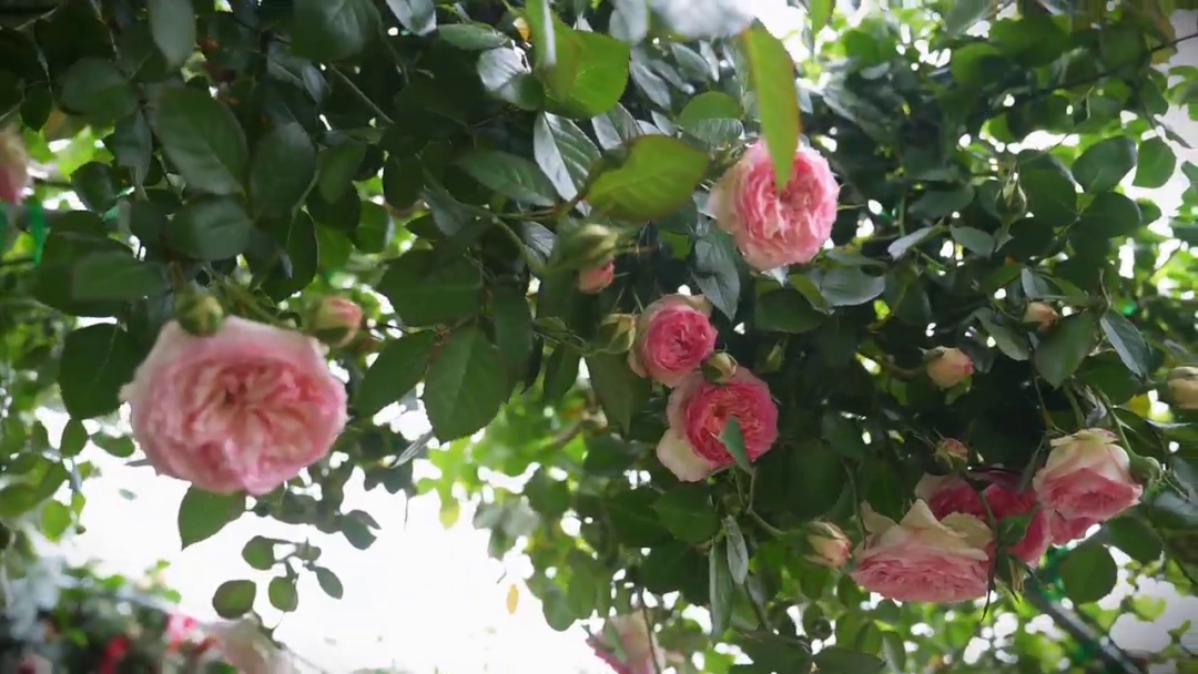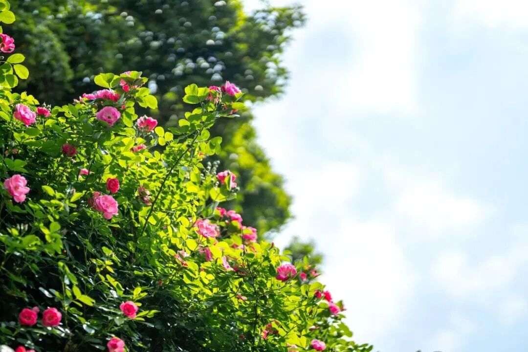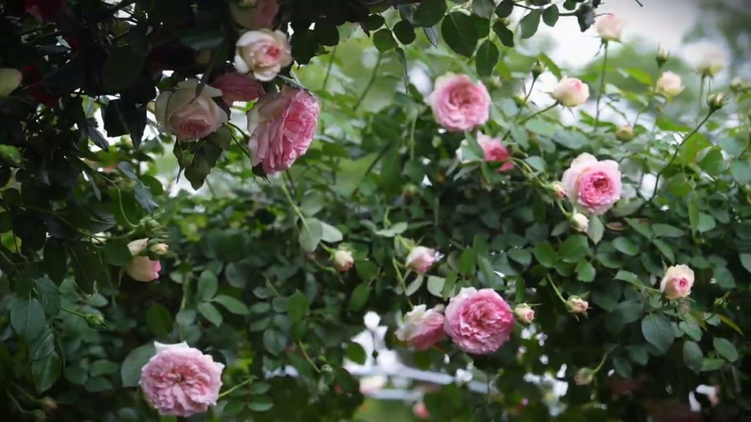 清晨露珠未晞时,上万朵重瓣月季如同被施了魔法,在晨光中渐次舒展。花瓣堆叠出天鹅绒般的质感,粉色从墙根流淌至檐角,仿佛印象派画家打翻的调色盘。