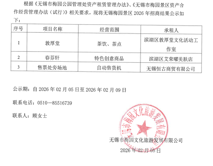 2026年梅园景区招商结果公示(三)