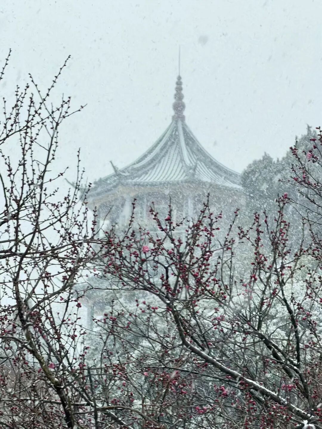 需要提醒大家的是,目前梅园仍处于闭园景观提升期间,暂无法接待游客入园游览。不过别遗憾,接下来就跟着这篇推文,一同“云赏”这片静谧的雪后梅园吧! ![]() ![]() ![]() 冬日信使 WINTER DAY 白雪却嫌春色晚,故穿庭树作飞花。 ![]() 雪是冬日的信使,轻柔地为梅园披上素白纱衣。远山隐去棱角,黛瓦覆满银霜,连蜿蜒的石径都铺上了一层松软的白毯,踩上去发出“咯吱咯吱”的轻响,成了这静谧天地里最治愈的伴奏。 ![]() ![]()