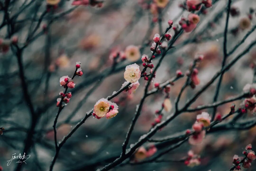 ![]() ![]() 红梅、白梅在枝头零星绽放,有的含苞待放,饱满的花苞如胭脂凝露;有的半开半合,似少女含羞带怯;偶有几朵全然舒展,娇嫩的瓣缘顶着薄薄一层积雪,冷与暖、素与艳在此刻完美交融。 ![]() ![]() ![]()