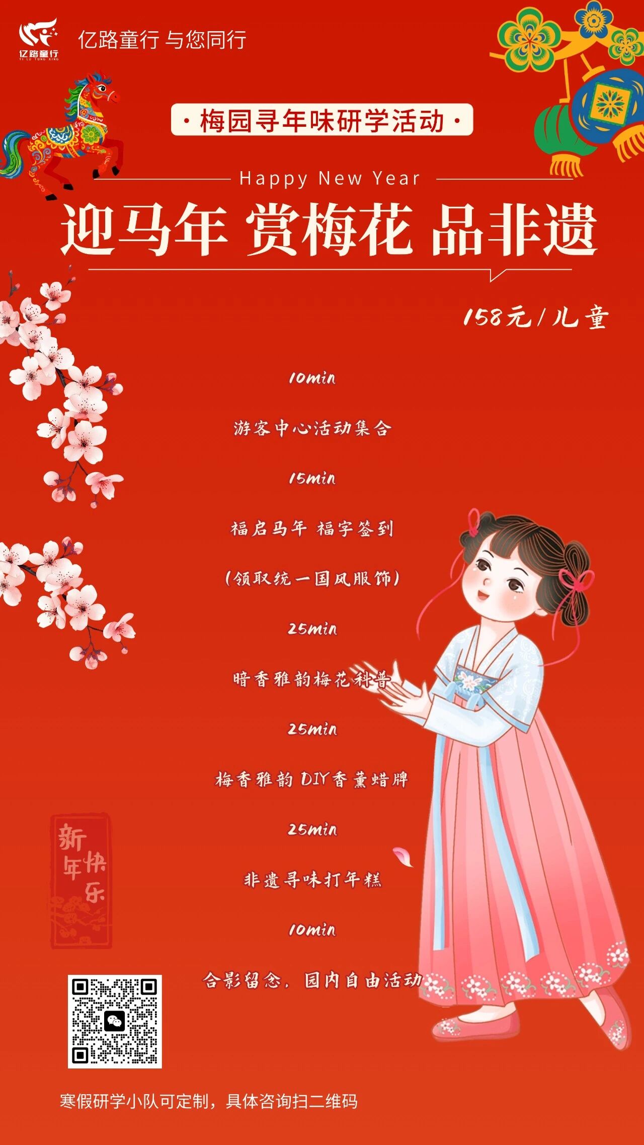 活动主题:迎马年|赏蜡梅 • 品非遗 活动地点:梅园 活动对象:3岁以上亲子家庭 活动时间:寒假研学小队定制,详情咨询主理人 咨询电话:灰灰老师 17712382258 活动价格:158元/儿童(可有一成人陪同) 特别说明: 1.活动的时间地点和价格,在报名链接里都有注明,报名参加活动时请仔细查看清楚。 2.本场活动15组成团,人数不足未成团的活动,我们会提前全额退款以免影响您的行程。 3.成团的活动,因个人原因,导致不能参加的: (1)活动前72小时可无责取消 (2)活动前48-72小时内取消/改期的,扣除活动费用30%。 (3)活动前24-48小时前取消的,扣除50%活动费用。 (4)活动前24小时内取消的,则全额扣款。 (5) 如有活动涉及的资源,如大巴,酒店及门票等在活动成团后尽快落实,我们要提前很多天支付全部或部分费用给合作方,这类活动会在小群提前特别说明,如有取消申请,则这部分费用独自承担,不可退款。 (6) 特殊情况:如遇临时生病,可凭诊断证明,随时免费取消或者延期。 4.活动开始后因个人原因迟到影响体验感或未到中途取消退款的,恕不退款! 5.活动报名成功,则视同默认活动规则,请大家报名时仔细查看活动链接详情,以免影响自身权益。 如有介意,可提前联亿路童行主理人。 6.活动过程中会随时进行摄像、摄影用于后期宣传,报名活动成功即视为同意我们对肖像权的使用。 7.为了确保活动安全规范,活动费用是包含一大一小保险,需提供家长和小朋友的姓名和身份证号码,如自愿放弃,需现场签免责协议,我方不承担任何责任。 8.如因不可抗力因素无法如期举行,活动会根据情况作出相应调整。 9.活动报名群主,报名成功以实际付款为准。 特别说明:参加活动请仔细查看该规则,一经缴费即视为默认组织方规定,组织不易,每场活动都有物料,前期调研和场次预定成本,感谢大家的支持,也希望不辜负彼此。 10.推文中部分图片可能来自网络,如有侵权,告知即删;
