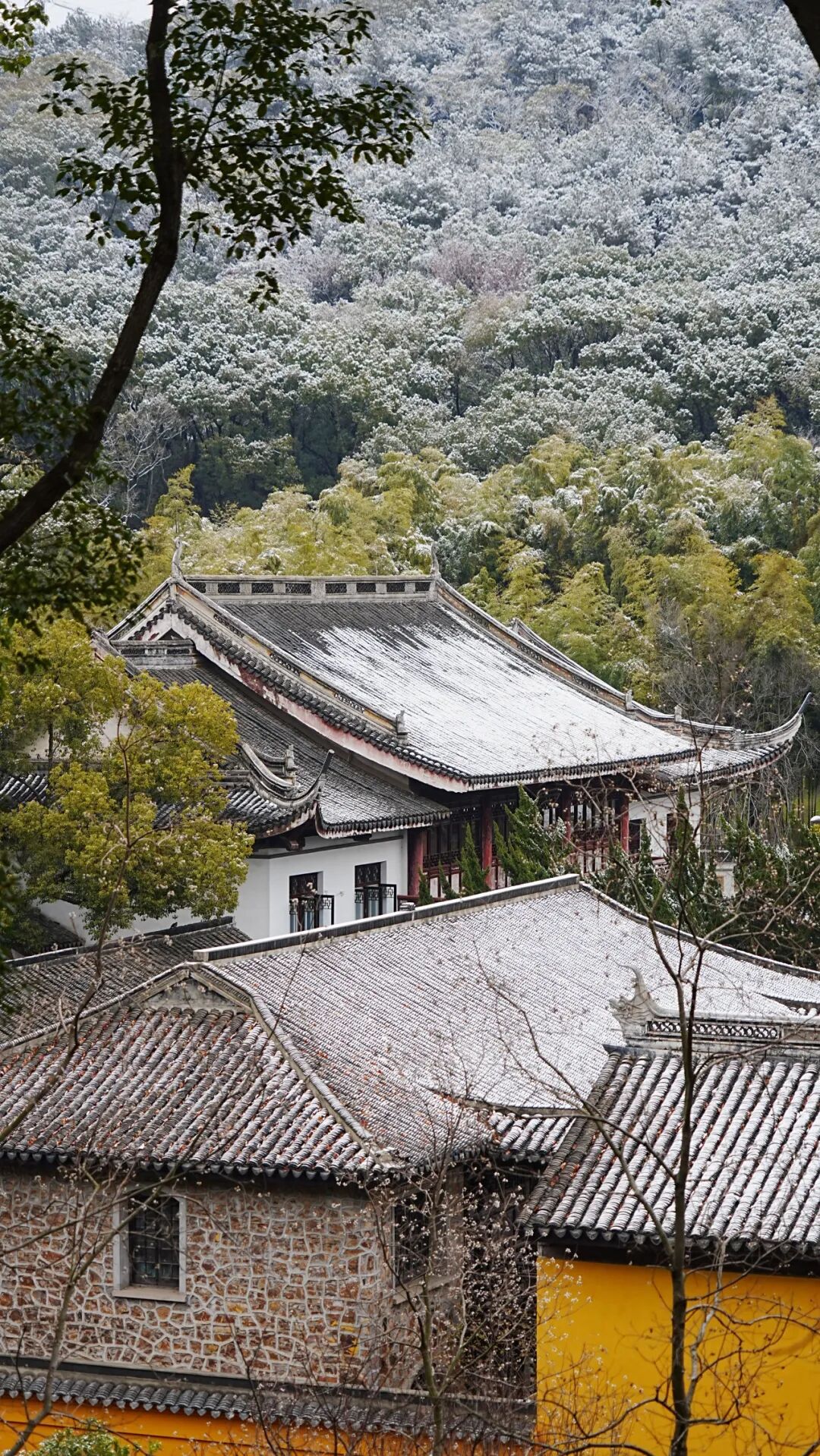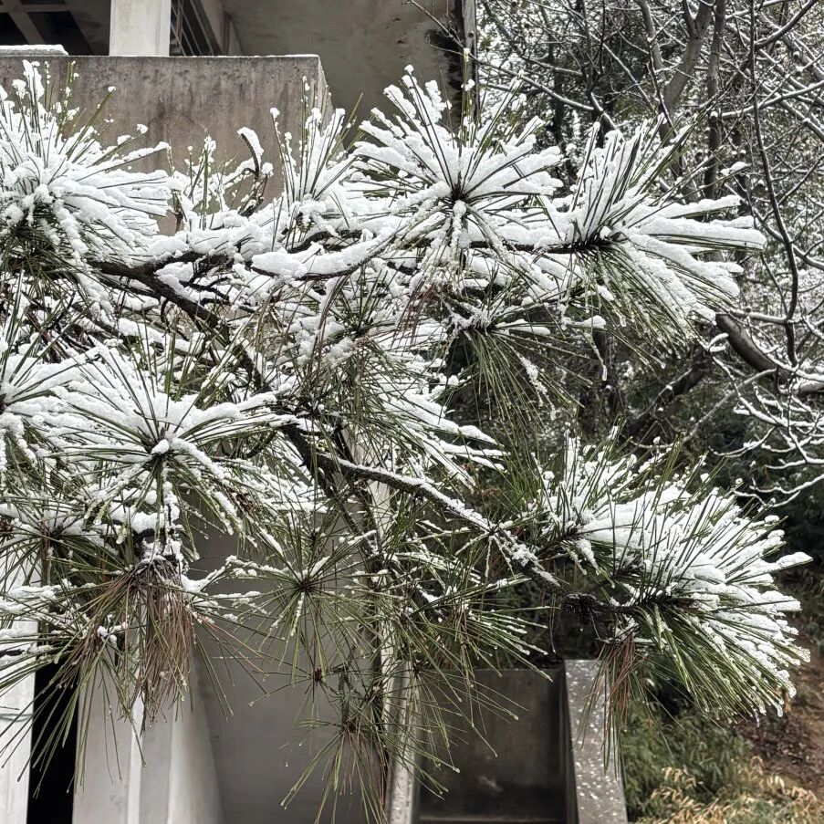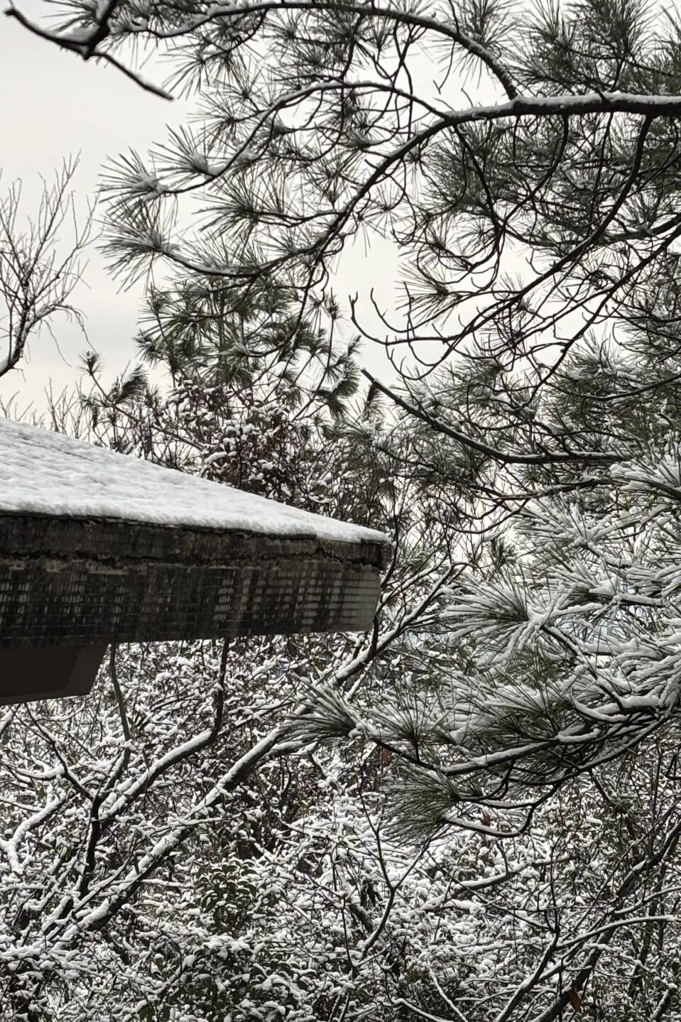 松枝裹着薄雪,亭檐覆着残白, 枝桠间的雪意迟迟未散。