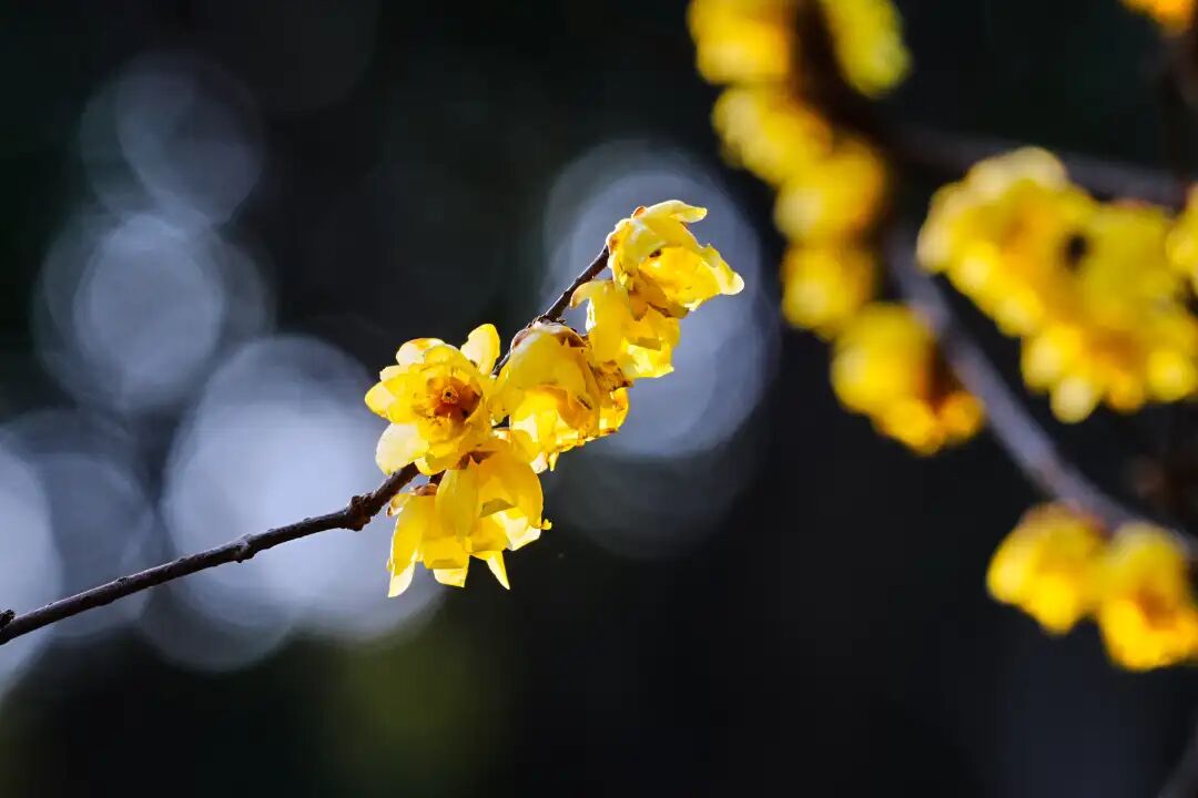 眼下园内的蜡梅开得正盛, 金黄的花缀满枝头,暗香浮动, 风一吹就是沁人心脾的甜香;