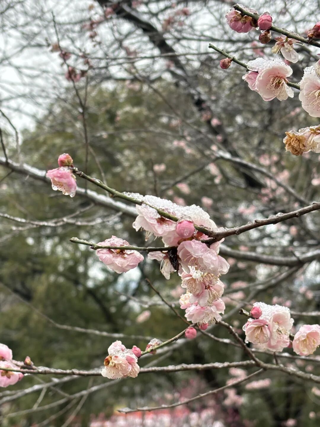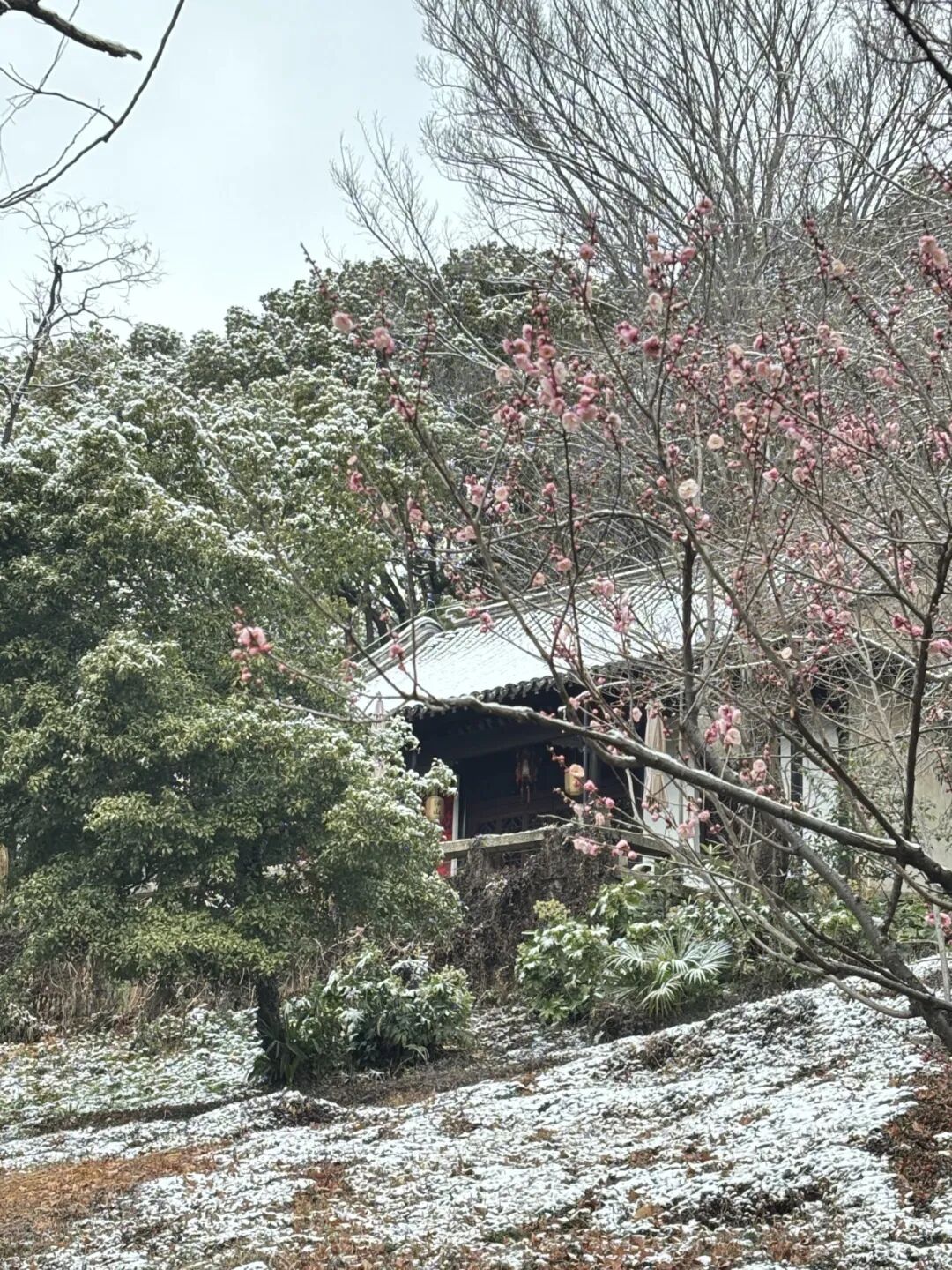 早梅也次第舒展花瓣,粉白、嫣红的花苞与花朵缀在枝头,搭配残雪与亭台楼阁,勾勒出最经典的江南冬春交界之美。