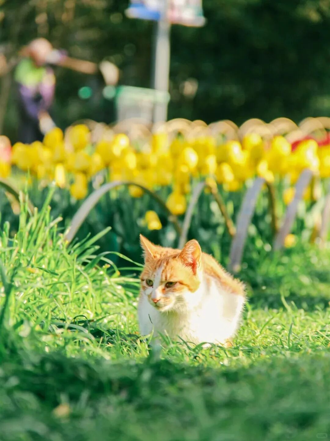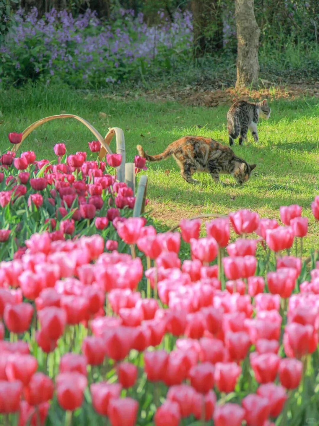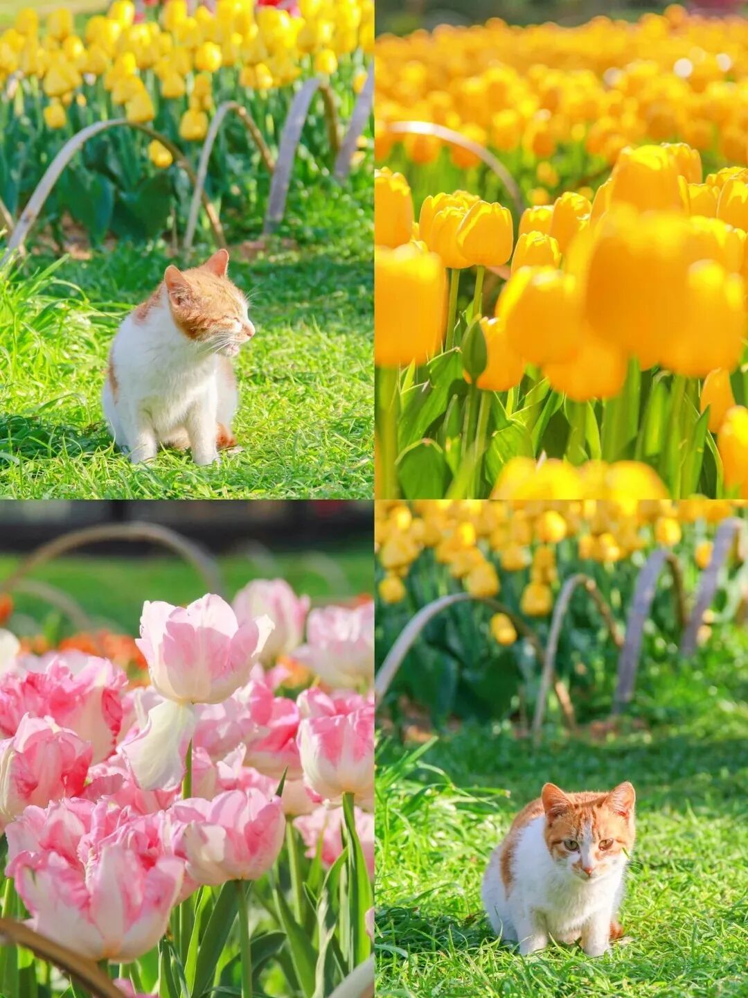 春风拂过,满园郁金香次第绽放, 粉的温柔、黄的明媚、紫的浪漫, 层层叠叠的花瓣裹着温柔的春意。 一只软乎乎的小猫悄悄踱步而来, 好奇地嗅着清甜的花香, 偶尔在花丛边蜷成一团,晒着暖阳打盹。