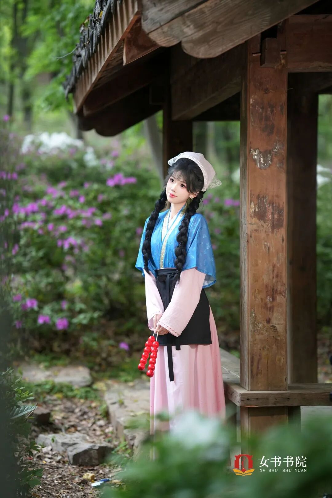 推开木门,蓝粉相间的宋制汉服与古旧的木构建筑相映成趣,双垂的麻花辫上别着素白头巾,手里的糖葫芦红得亮眼,像从旧时光里走出来的江南少女。