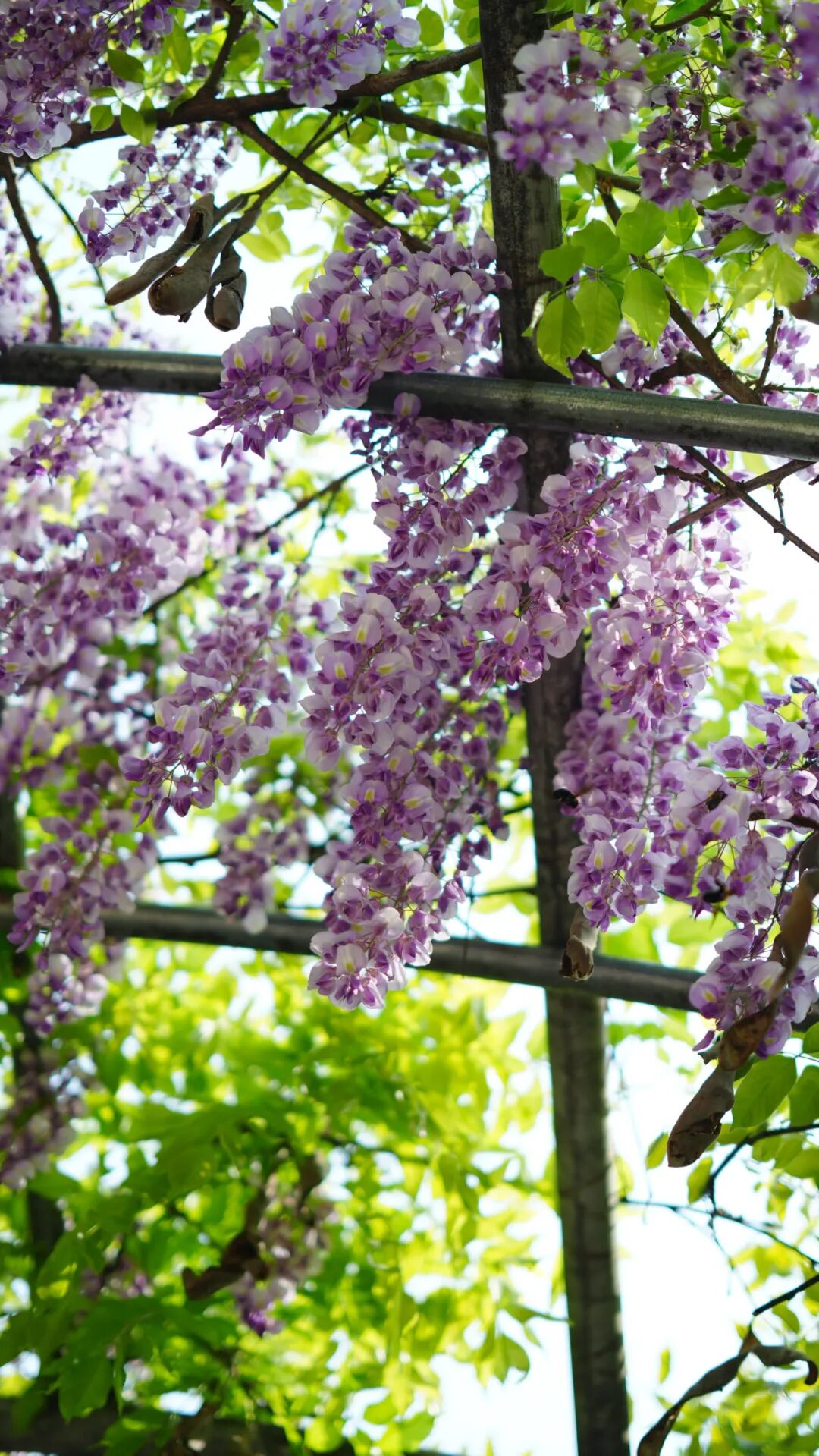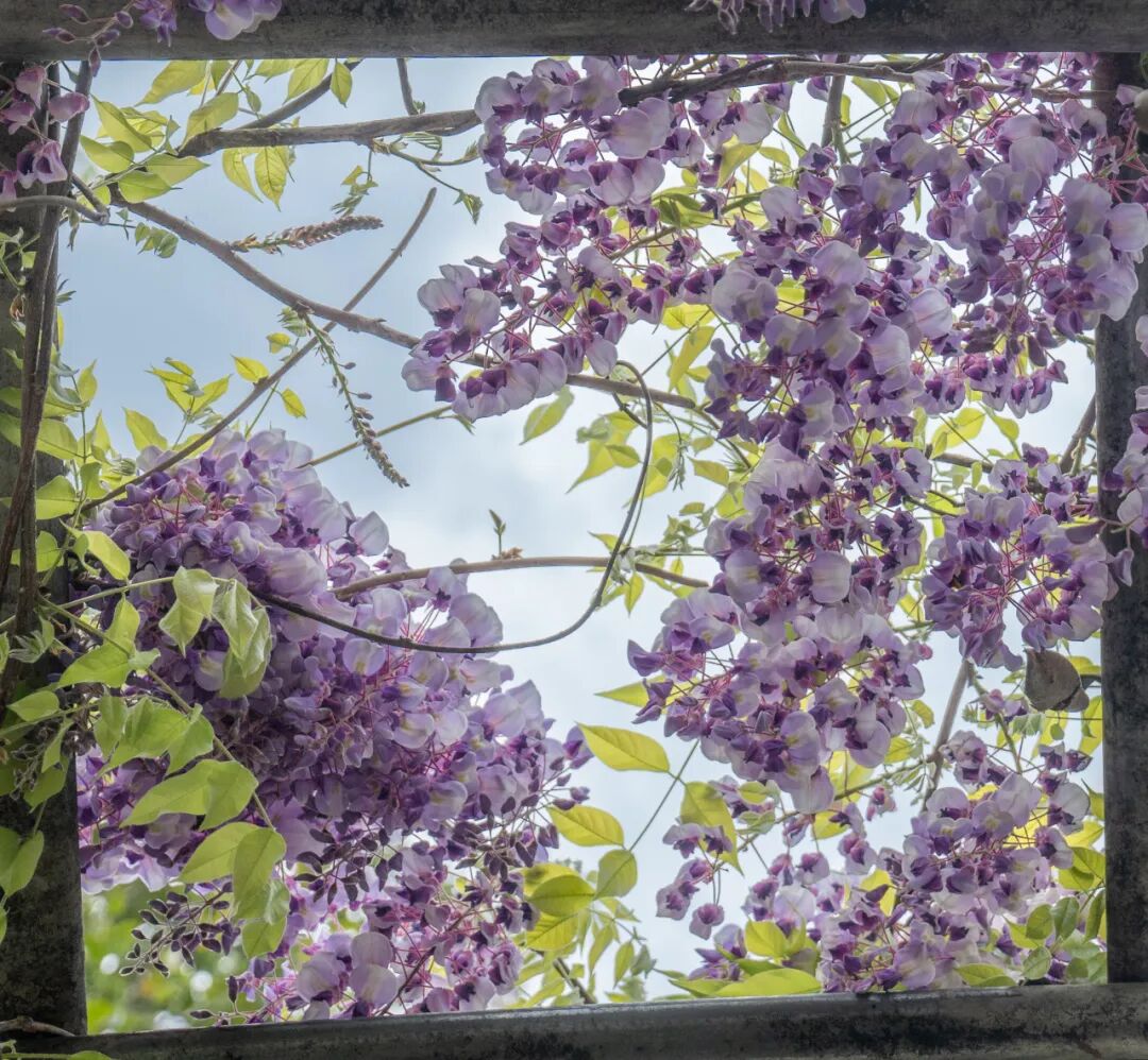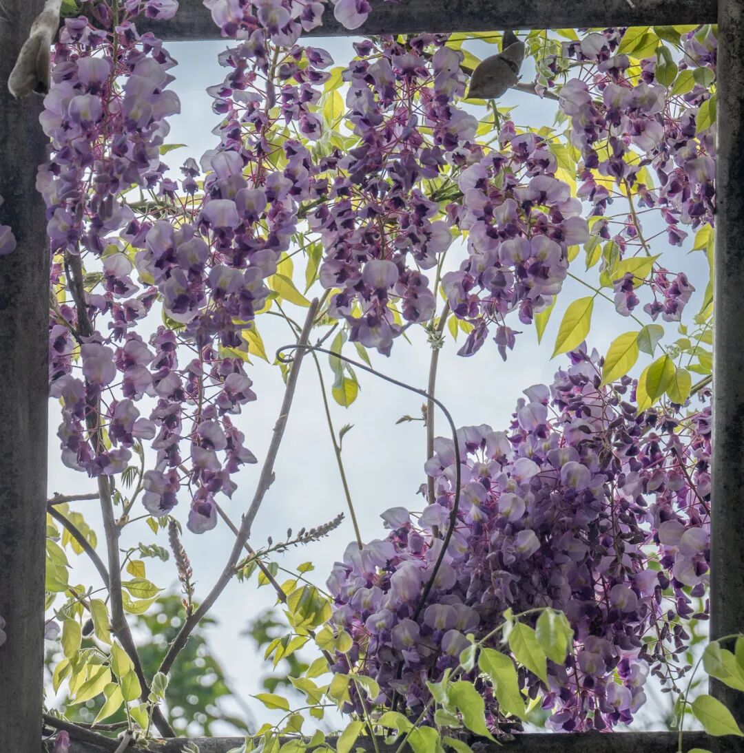 4月正是紫藤的盛花期,一串串紫穗垂垂落落,似紫色的风铃,缀满廊架与枝头,紫中带蓝,清雅动人。