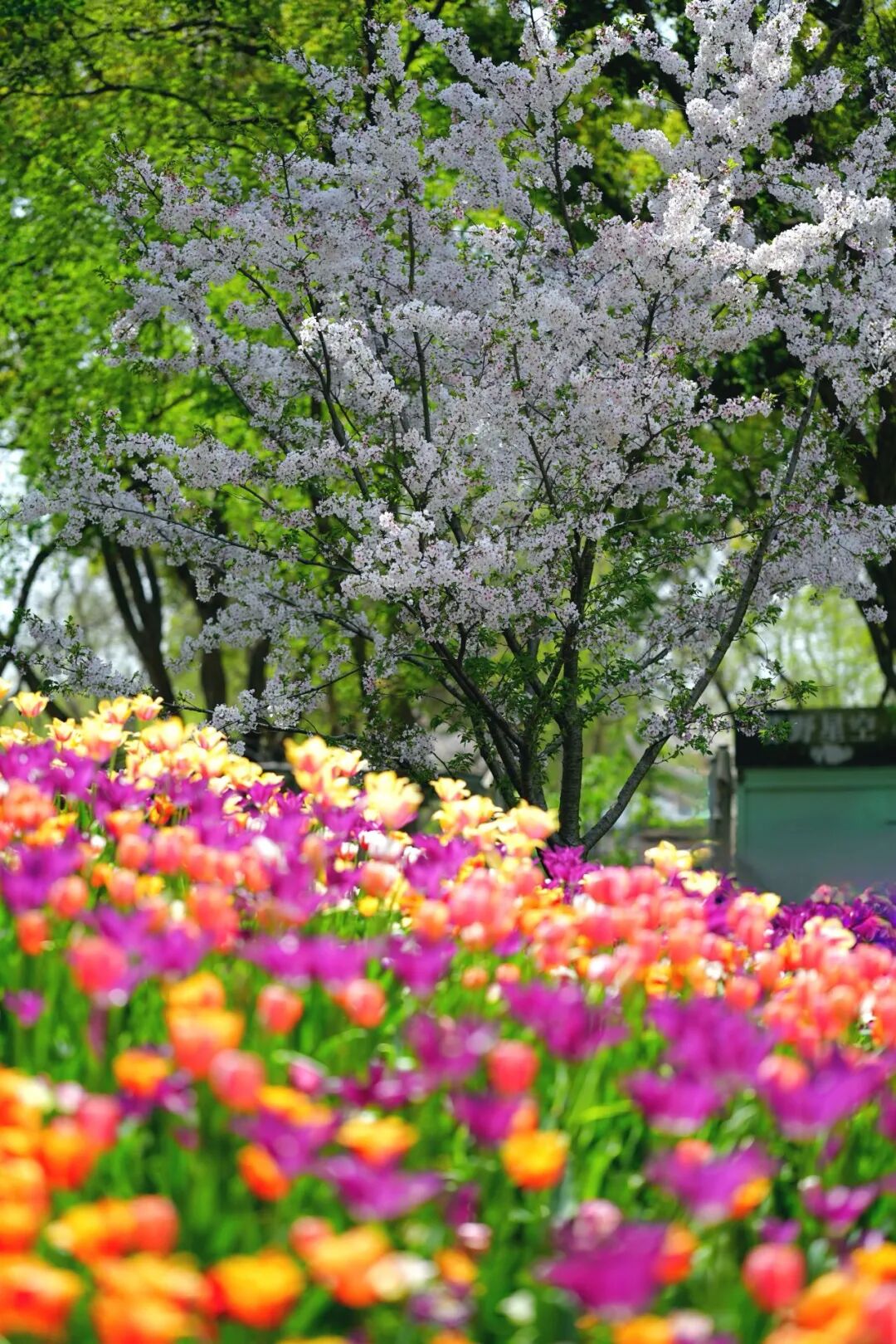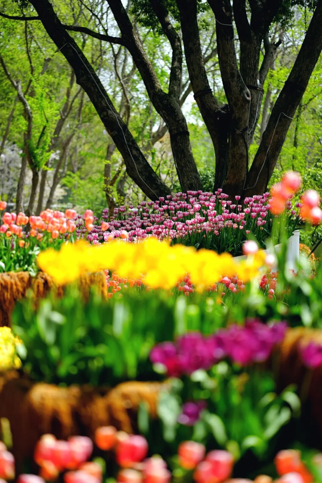 20万余株、20余个品种的郁金香次第铺展,从荷兰广场到三角枫林,从花溪畔到积雪堂周边,明黄、绛紫、胭红、雪白、复色的花影交织成毯,像被春风打翻的调色盘,惊艳了整个春日。