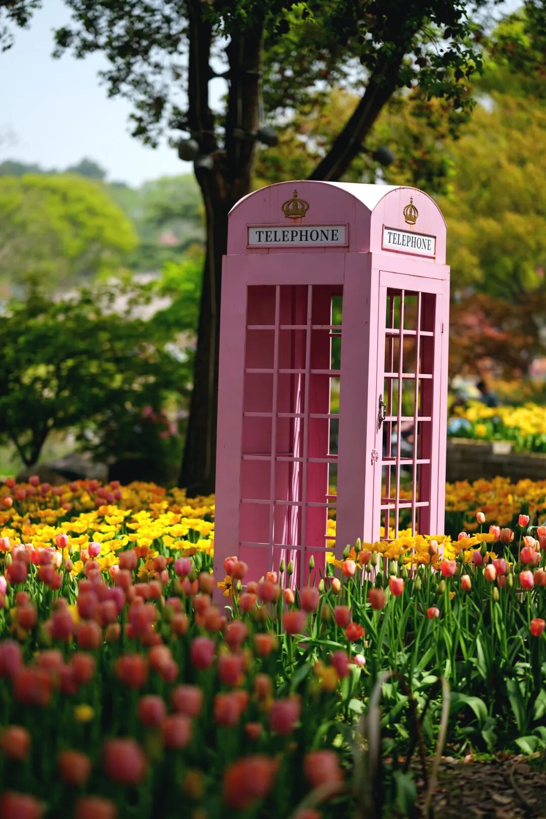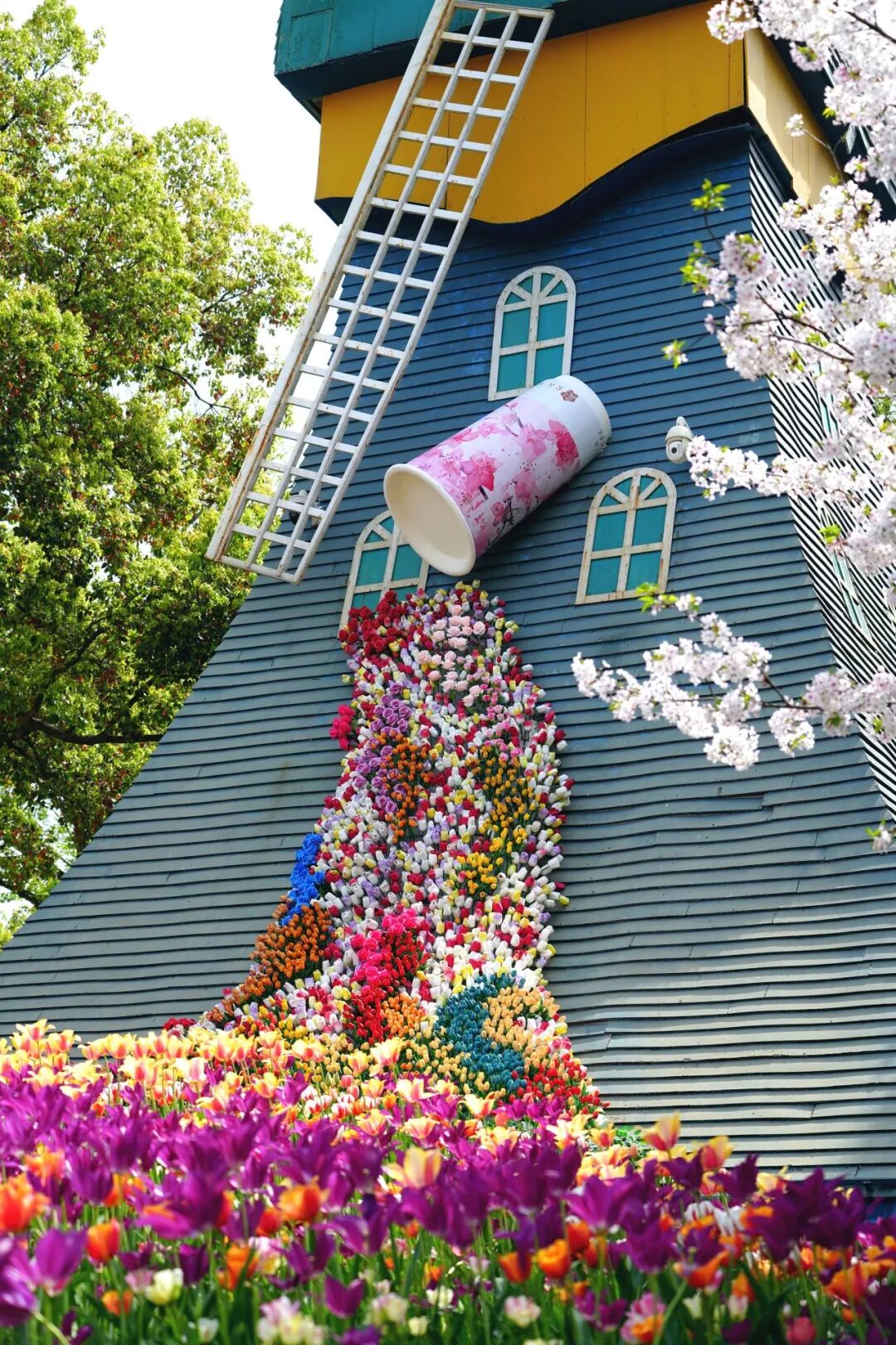 阳光洒在杯状的花瓣上,光影流转间,每一朵都似在踮脚起舞,搭配园区的欧式风车,仿佛一秒穿越至阿姆斯特丹的街头,随手一拍都是治愈系大片。
