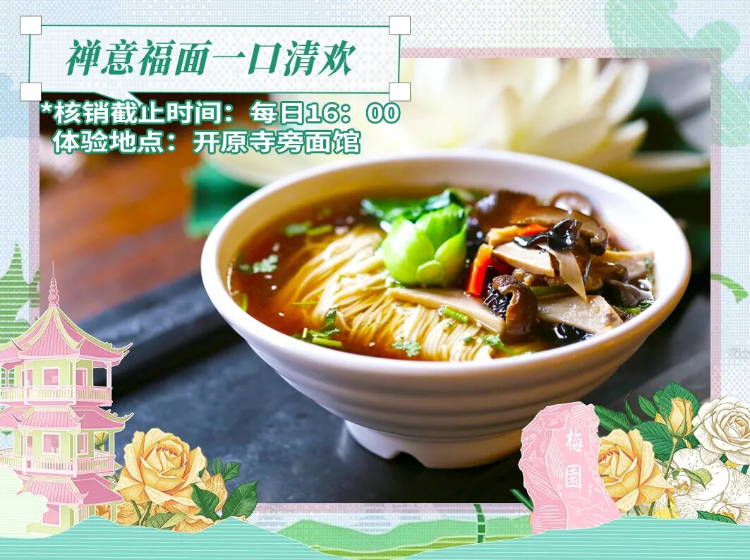 鲜醇的汤底搭配劲道的面条, 菌菇与青菜点缀其间, 一口下去,满是江南烟火气, 也为你的旅程添一份安康顺遂的美好祈愿, 把春日的暖意吃进肚子里。 核销截止时间:每日16:00