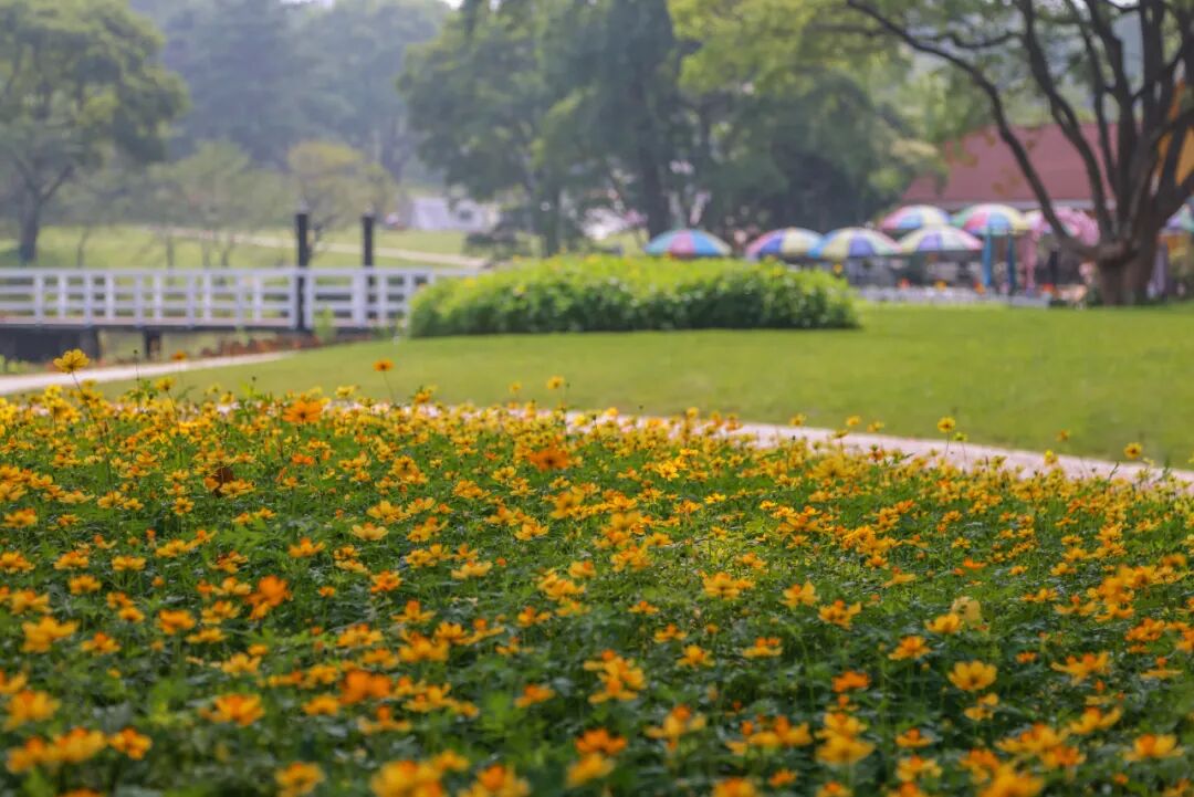 树荫浓密,摇曳着的是两千多平的硫华菊花海,树林中的气温要比市区低5℃左右。花溪更是迷雾缭绕,变幻多姿,宛如仙境,惬意、舒适之感扑面而来。